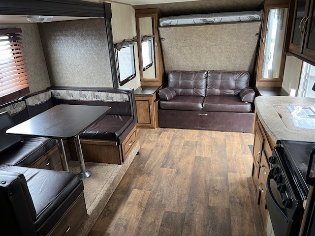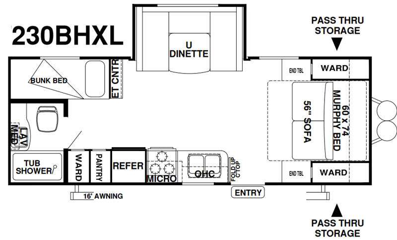 Step inside model 230BHXL and notice how open it is with the slide out u-shaped dinette fully extended opposite the door. There is a nearby entertainment center for viewing.