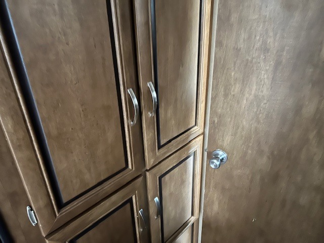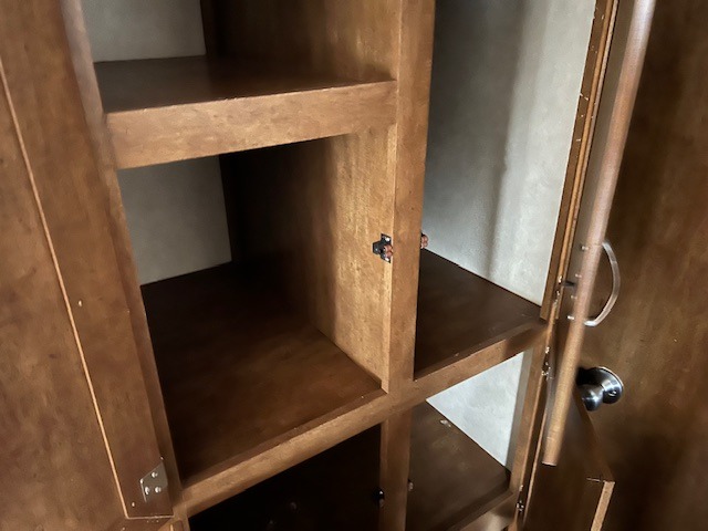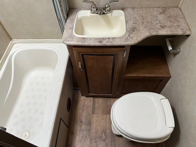 The rear corner offers a set of bunks that the kids will certainly enjoy, plus the convenient bathroom right next door that features a tub/shower, toilet, and vanity with sink. There is also a wardrobe for storage just outside the bathroom door.