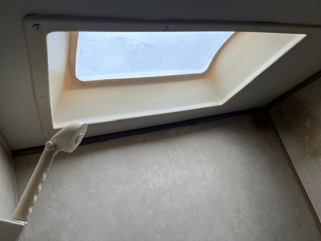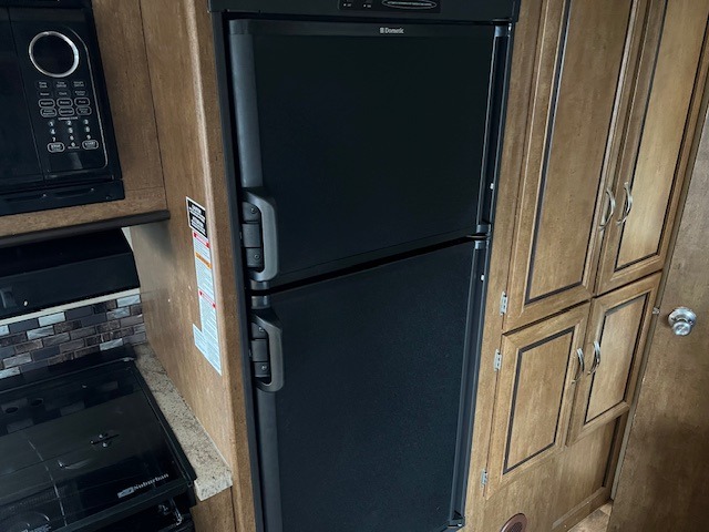 To the left of the entrance you can easily cook up light meals and snacks for the whole gang when camping. There is a double sink with fold up counter-top, a three burner range with overhead microwave oven, a refrigerator, and pantry for dry and canned food storage needs. You will also find plenty of overhead storage for dishes and things.
