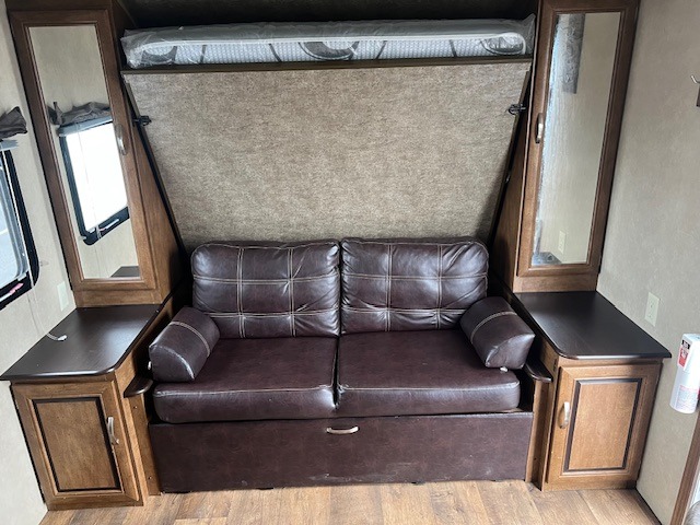 Up front to the right of the entrance is a dual living space with queen Murphy bed at night including wardrobes for storage, and a 56" sofa with two end tables during the daytime hours.