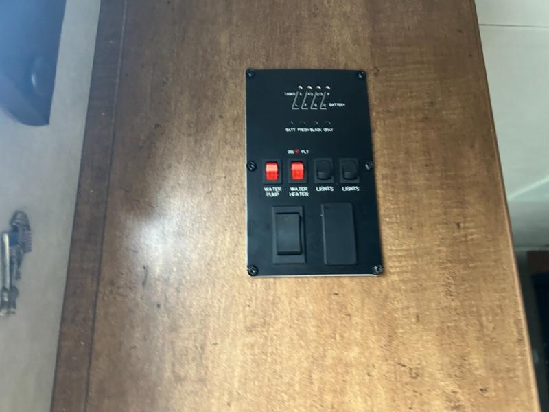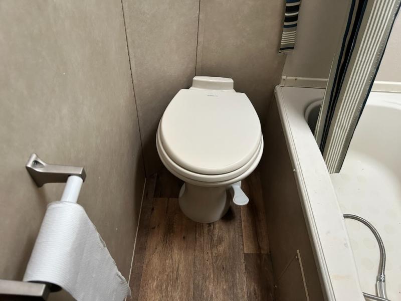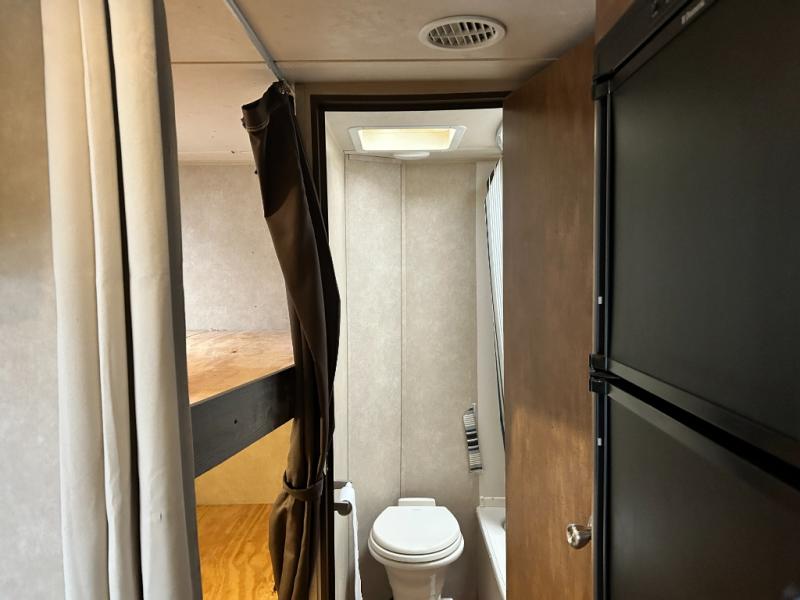 On the opposite side of the bunks is where you will find the bathroom. In the bathroom area there is a toilet and a shower/tub. Just outside of the bathroom there is a sink and medicine cabinet.