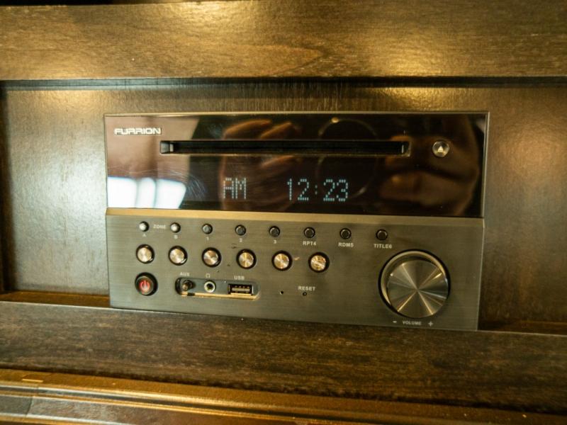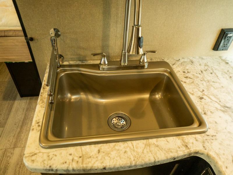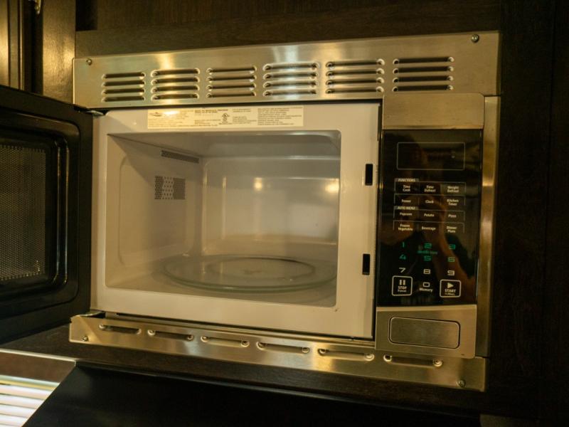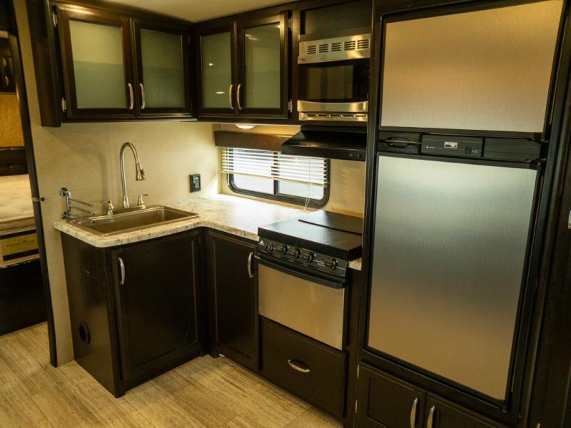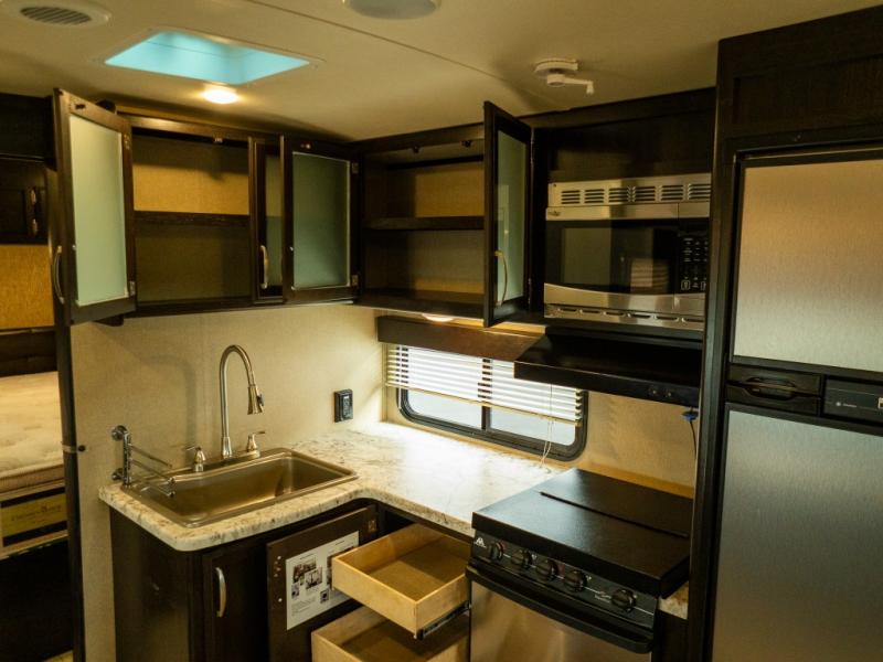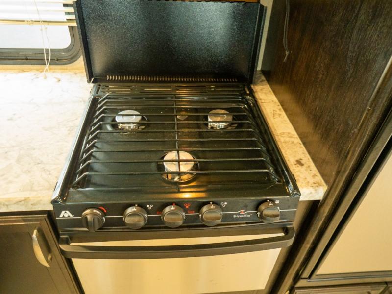 To the right of the entry door beyond the entertainment center including storage space in a handy wardrobe and pantry find the kitchen area where you can easily whip up light meals and snacks for your family and friends. There is a refrigerator that includes a pet dish beneath for easy access. You will also find a three burner range with overhead microwave oven, and a large sink for doing the dishes. Another skylight over the kitchen area brings in a lot of natural light.