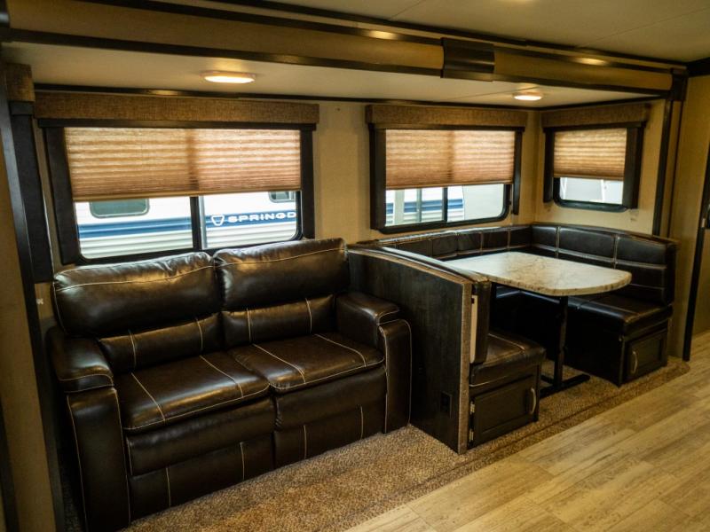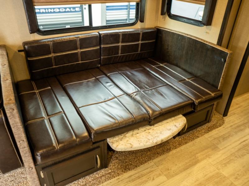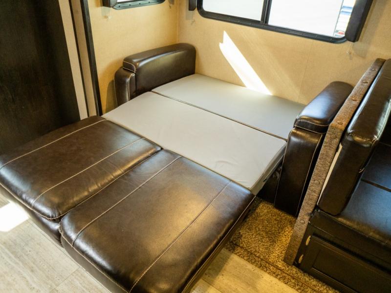 Straight in from the entry door you can enjoy theater seating or an optional tri-fold sofa that slides out along with a u-shaped dinette, or an optional free standing table with chairs. There is also a removable ottoman for when you want to kick back and relax watching your favorite shows on the 32" LED TV found in the entertainment center to the right of the door.The tri-fold sofa choice and the u-shaped dinette can also offer additional sleeping space for overnight guests.