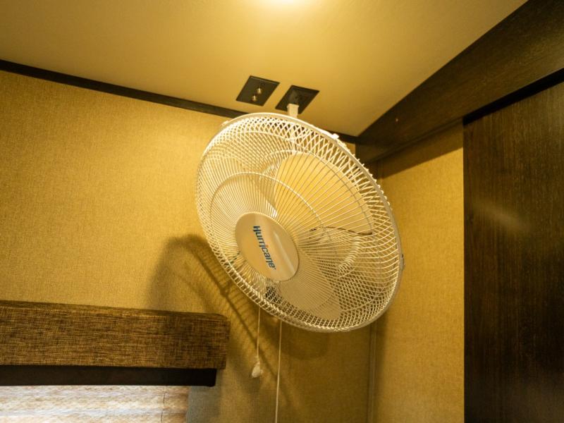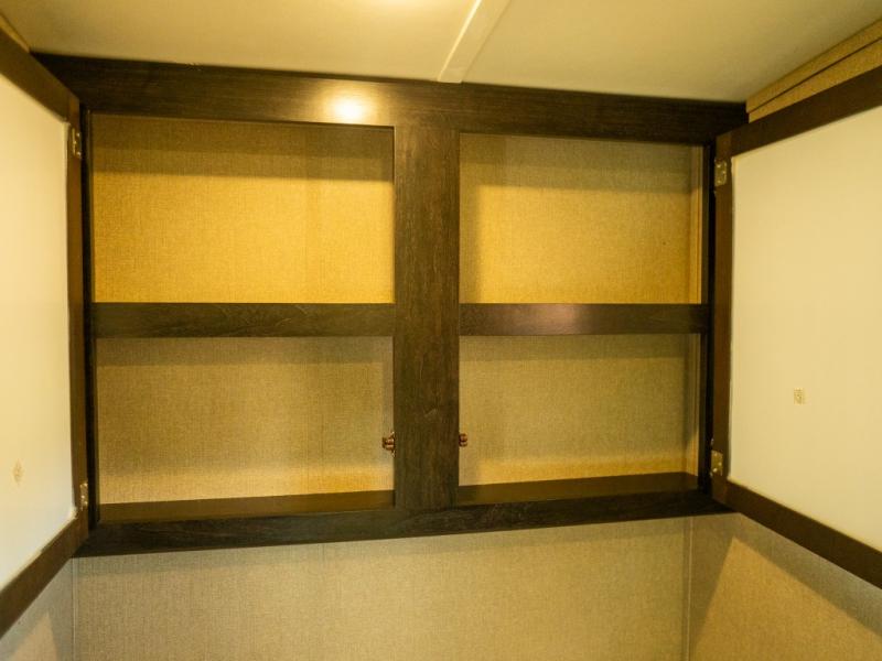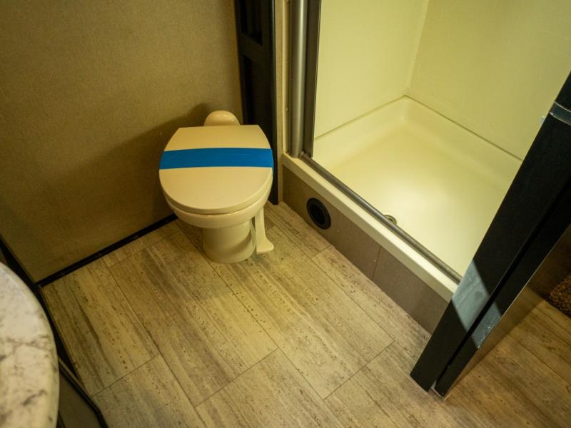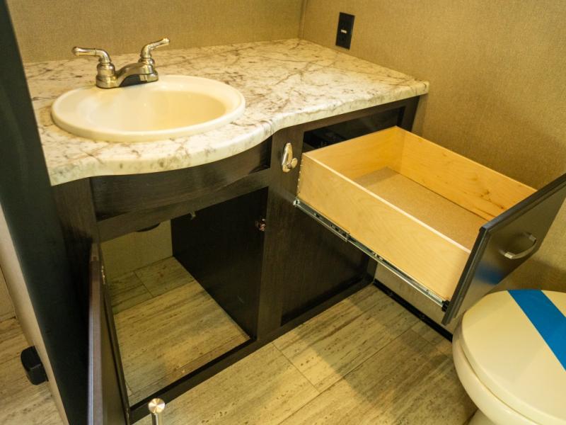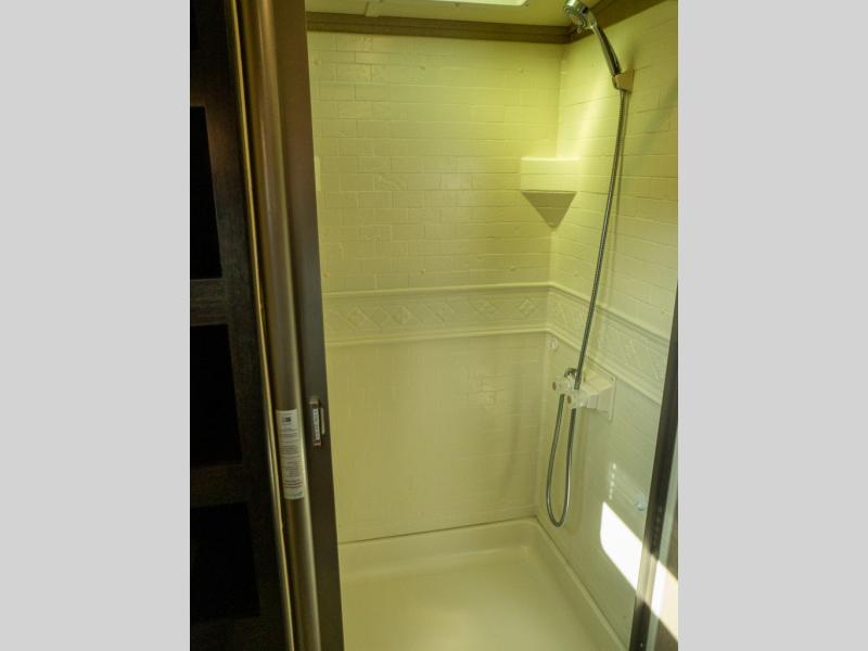 Step inside model 2600RB and find a rear bath to your immediate left. Here you will find a 30" x 36" shower, linen cabinet, toilet, and vanity with sink, plus overhead storage. The bathroom features a space saving sliding door.