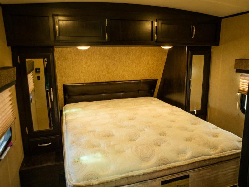 The front features a spacious bedroom with a queen size bed, dual bedside wardrobes for storage, plus more in the overhead cabinets.