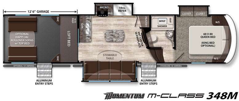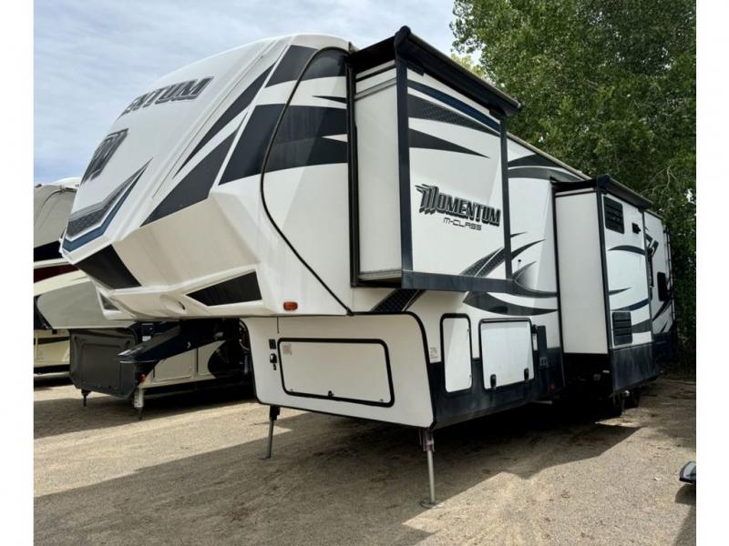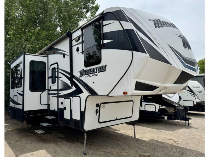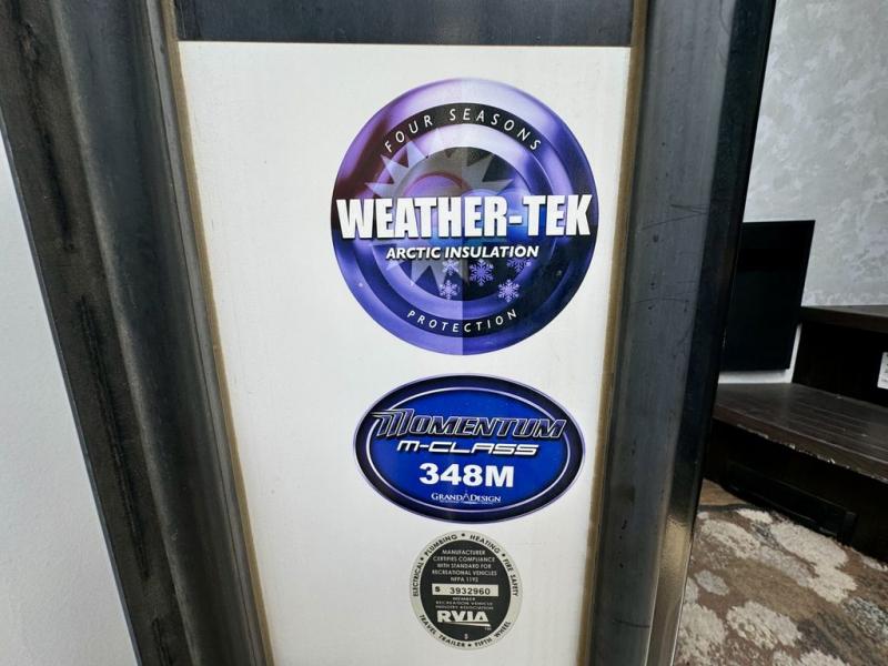 Enjoy every adventure in this Momentum M-class fifth wheel toy hauler by Grand Design. Model 348M features triple slides for added interior space, dual entry for easy in and out, a loft bed for additional sleeping space, a 12'6" garage for your toys, a fireplace for those chilly nights, and a kitchen island for preparing and serving meals!
