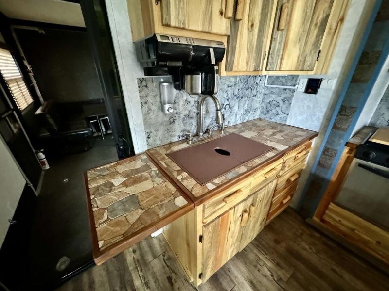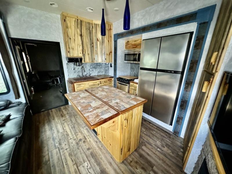 Opposite the door side find a spacious kitchen with a large sink, overhead cabinets for dishes and things, and counter space along one interior wall. On the opposite wall is a large pantry for your non-perishables. Plus there is a road side slide out including a three burner range, microwave, and a refrigerator. The kitchen island completes this space providing extra countertop for preparing or serving meals and snacks.
