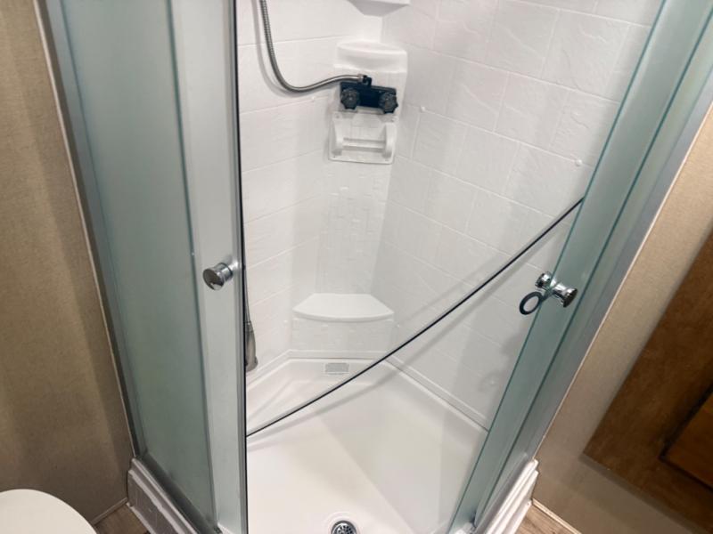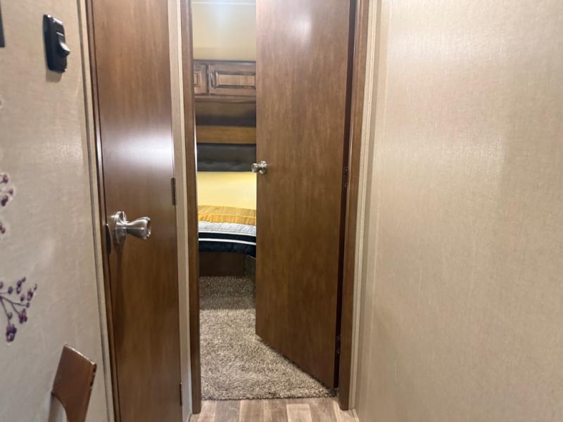 The private front bedroom can be entered from the hallway door, or through the sliding door in the bathroom. In the bedroom find a queen bed with overhead cabinets, bedside nightstands, and a slide out double wardrobe that also contains the bathroom linen cabinet, plus so much more!