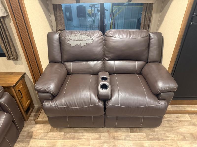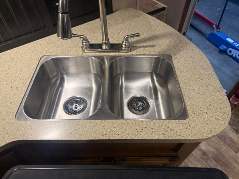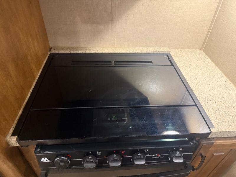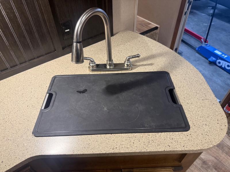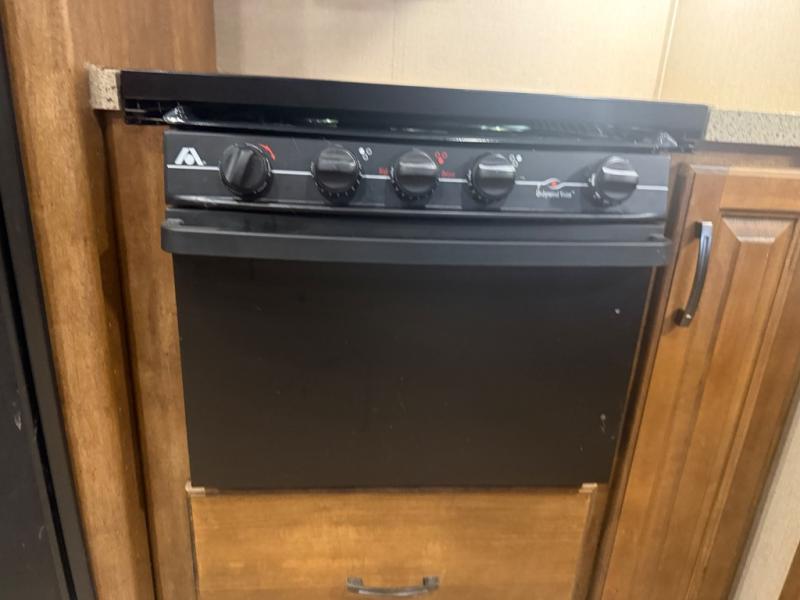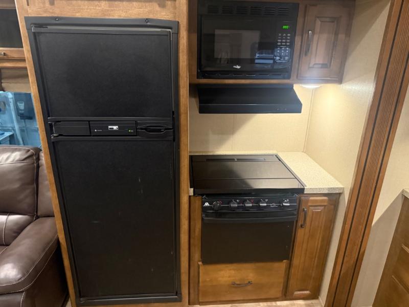 The slide opposite the door side features even more seating with theater seats for two including cup holders and overhead cabinets for your things. There is also a refrigerator, and three burner range with microwave oven within the slide out too. Along the interior living area wall find a counter-top with a sink, overhead storage, plus lower cupboards and drawer space for dishes and things.