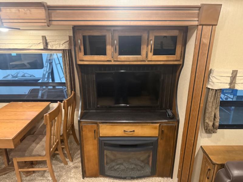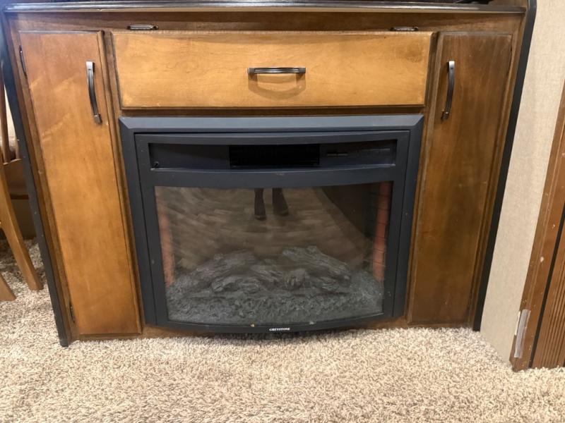 As you enter notice the spaciousness inside with dual opposing slide outs on either side of the unit. The slide to the left of the entry door features a booth dinette, or optional free standing dinette (pictured) along with an entertainment center and fireplace including overhead cabinets.