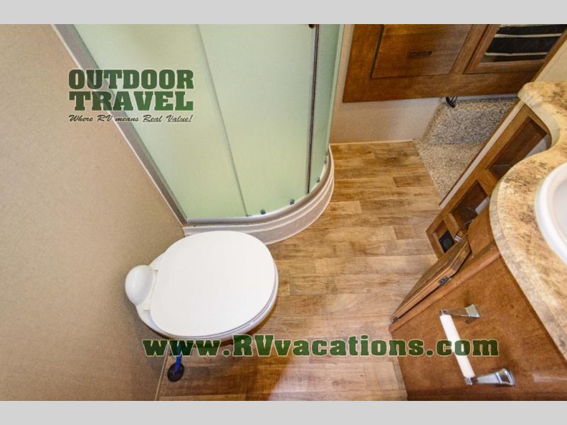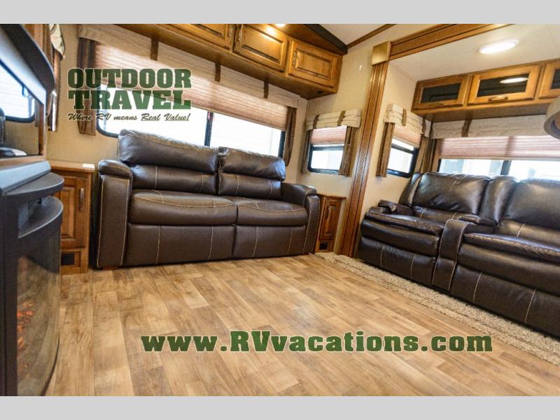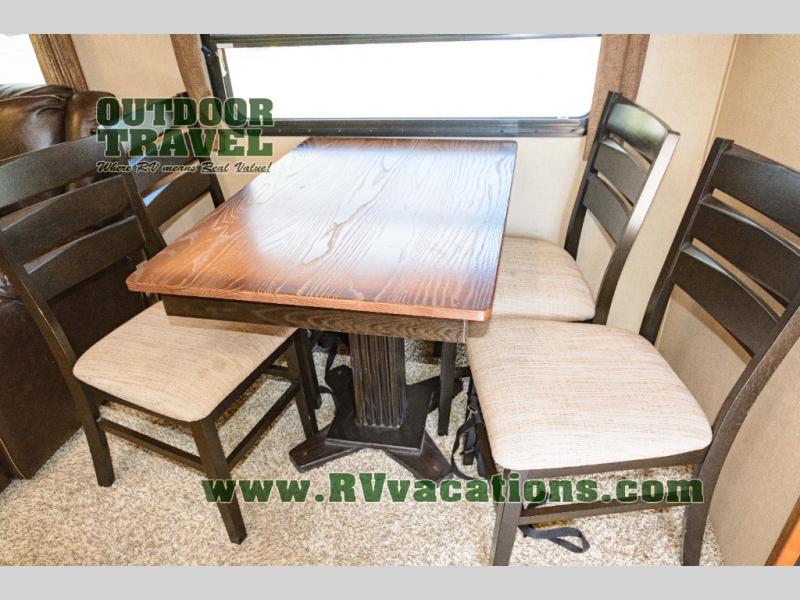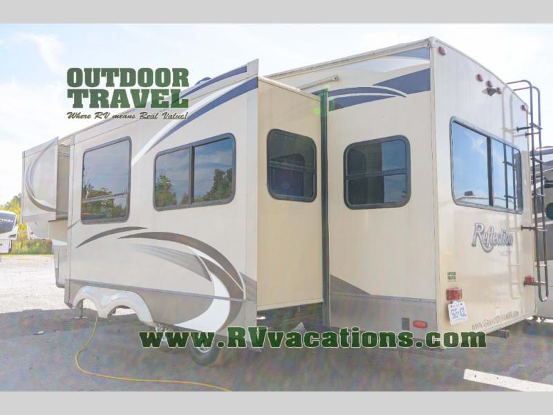 Across the rear wall of this Reflection unit you will enjoy a tri-fold hide-a-bed sofa with storage cabinets above to store more camping items. Adjacent, in the second living area slide out you will find theater seating for two and an optional free standing dinette instead of a booth dinette.