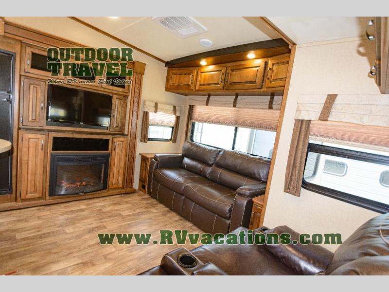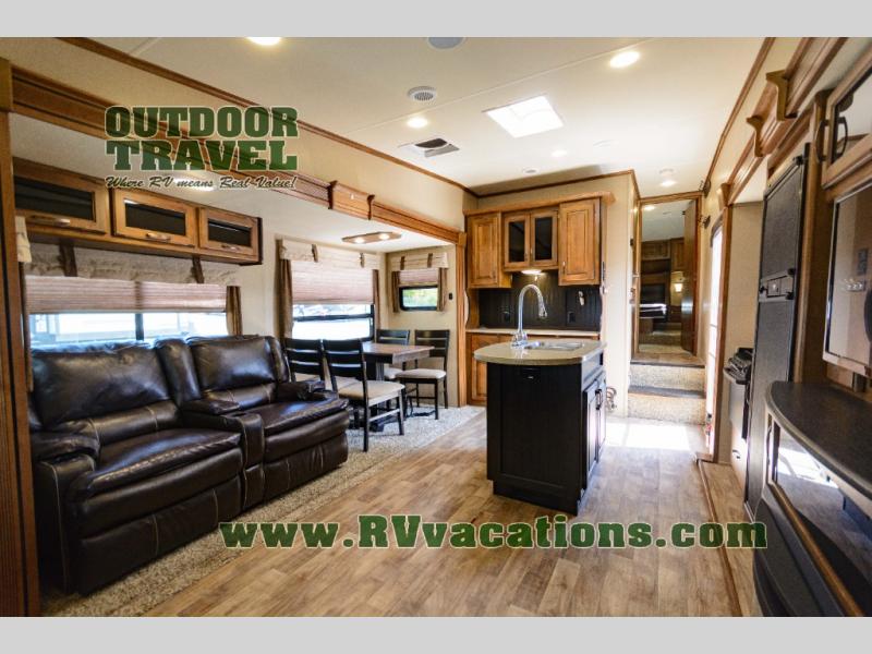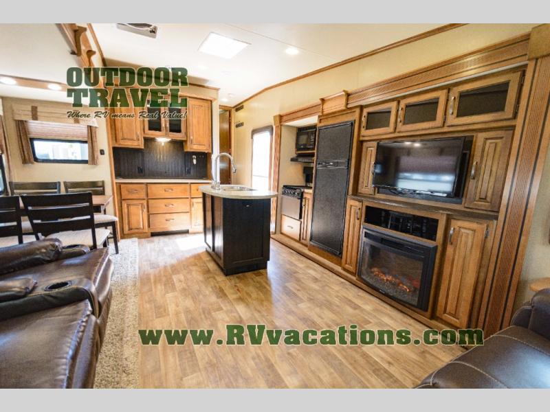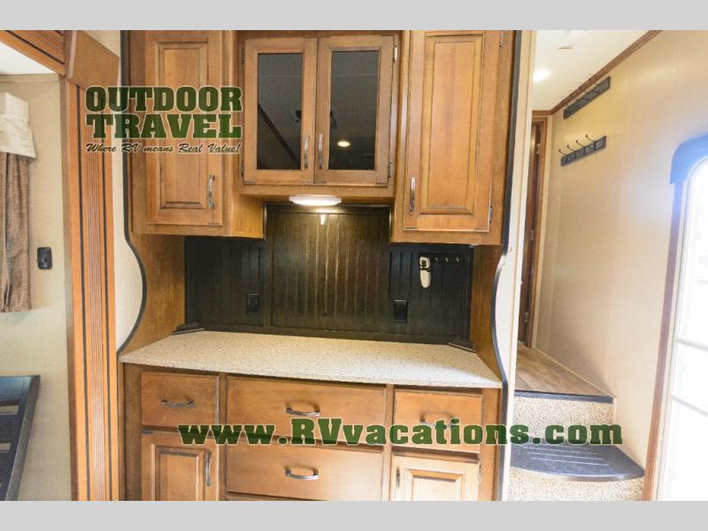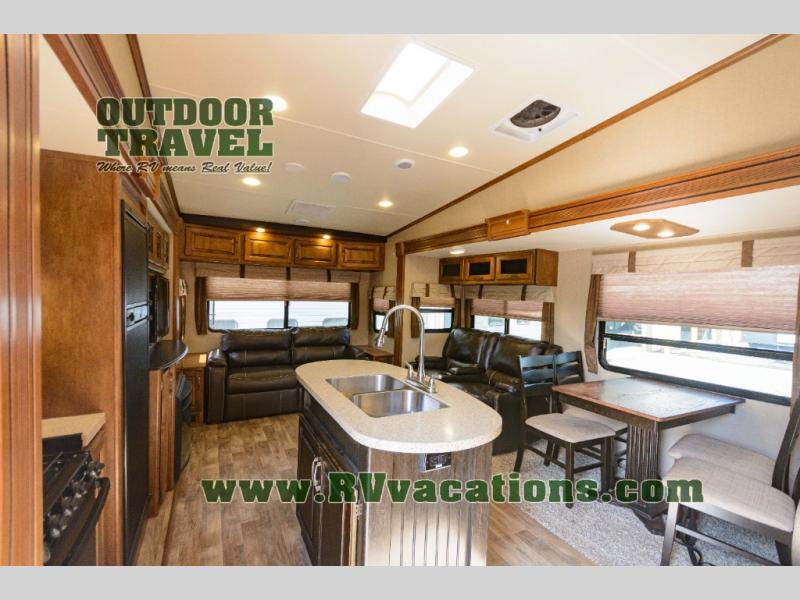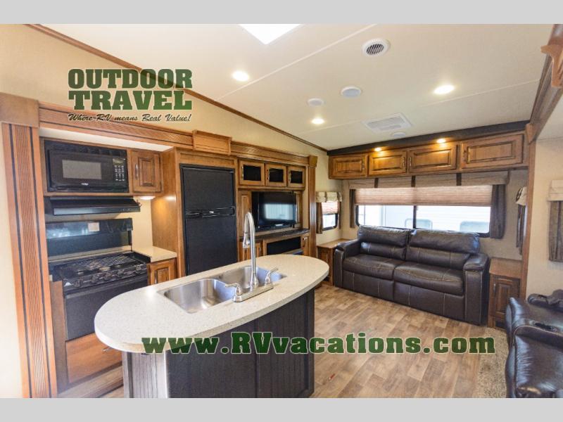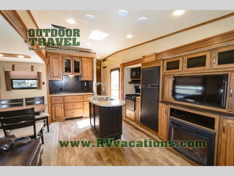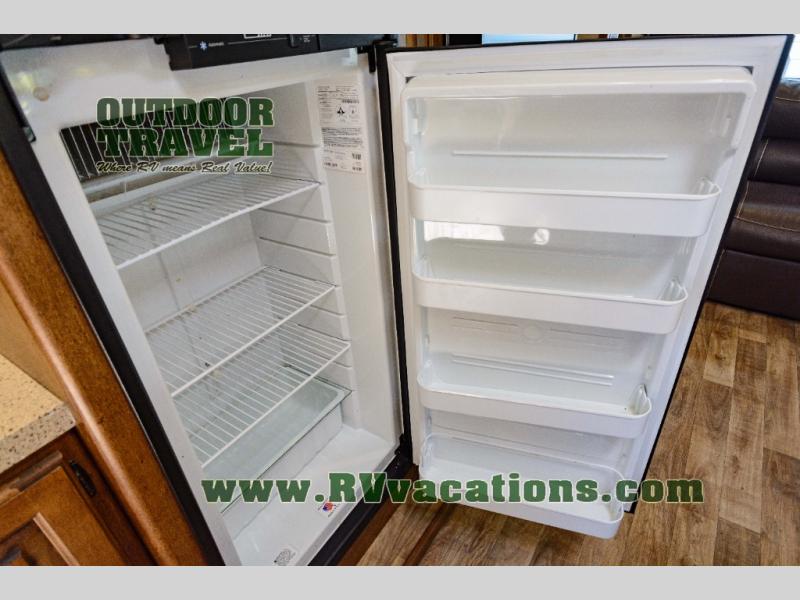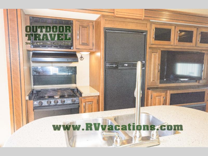 Back down on the main level find a kitchen area with countertop and overhead storage space along the interior living area wall. There is a convenient island with a large sink and counter prep space. The first slide out is along the entrance door wall including a three burner range with microwave above, a refrigerator, and an entertainment center with 32" TV plus a fireplace.
