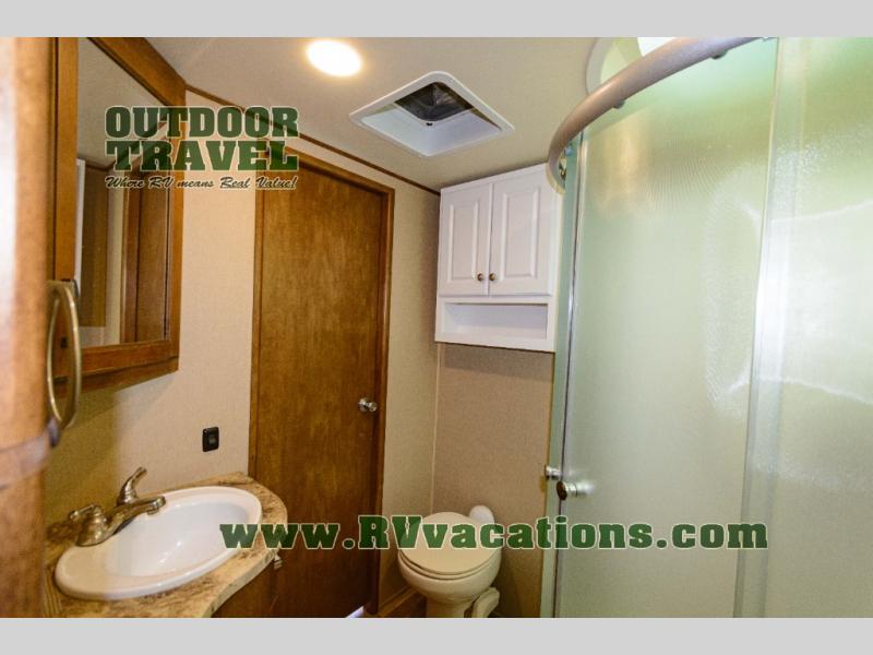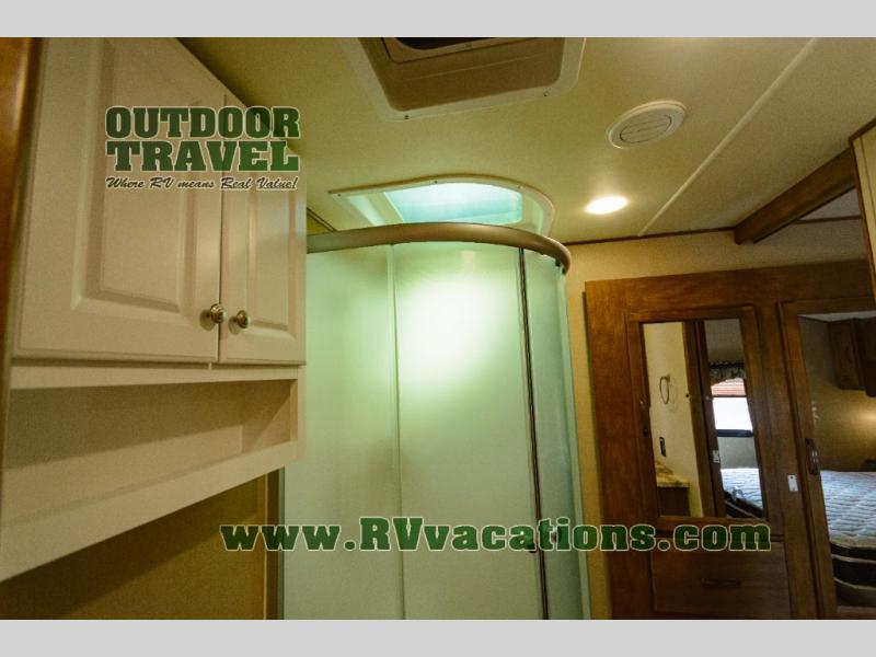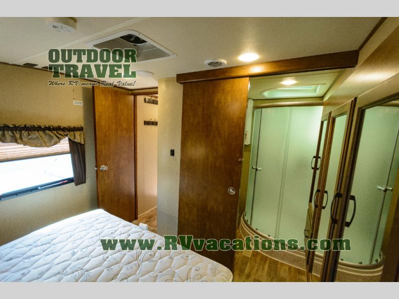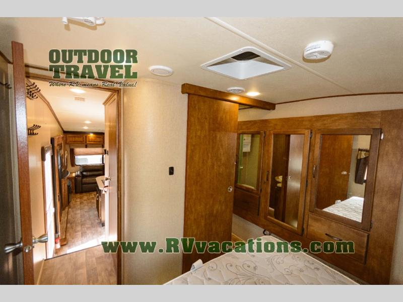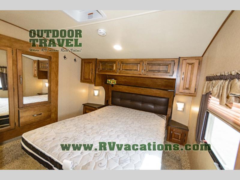 In the bedroom find a queen size bed, overhead cabinets on either side of the bed, plus above the head of the bed as well. There are also slide out wardrobes for your clothing, plus the linen cabinet that is accessible from within the bathroom.