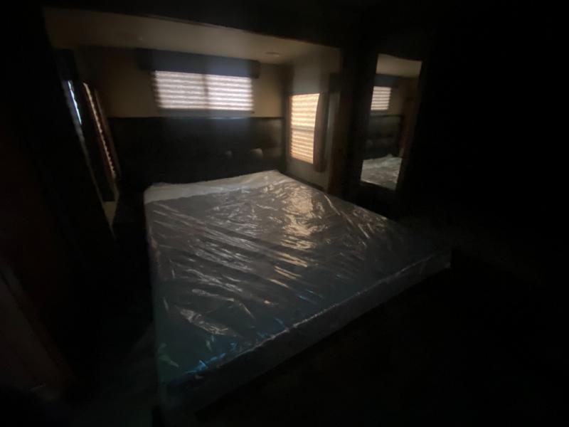 The master bedroom can also be accessed from a hall doorway. Inside find a queen bed slide, or choose the optional king. There is exterior storage at the head of the bed slide. Opposite along the curb side wall find a dresser with storage above, and a space prepped for TV if you wish to add. The front wall features a wardrobe with pass-through access and washer/dryer prep.