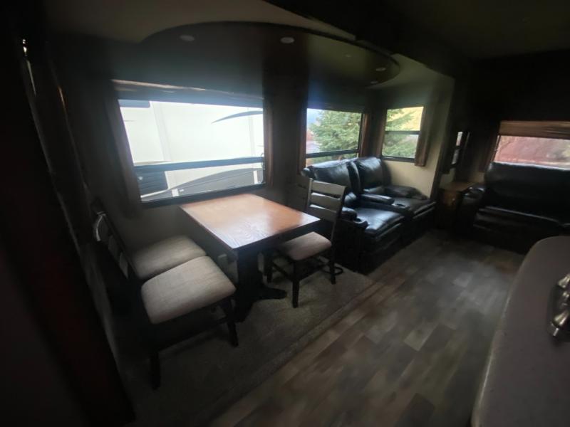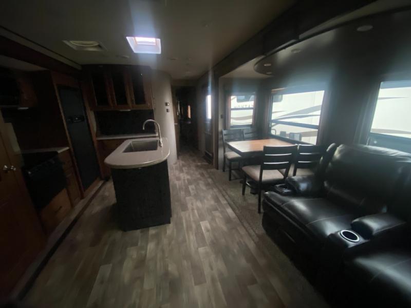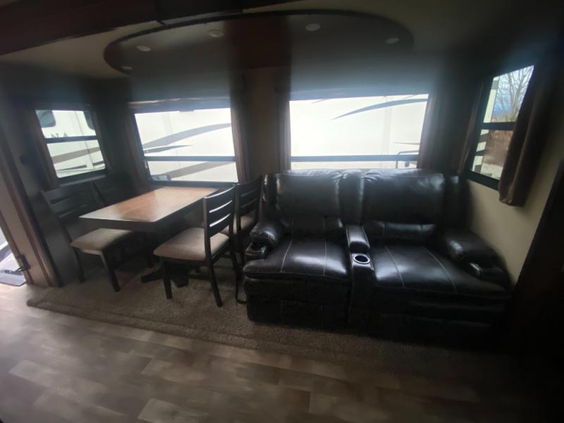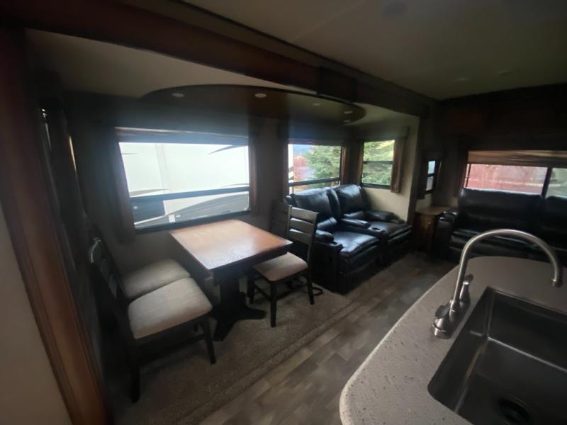 To the left as you enter Reflection 313RLTS you will see a spacious combined kitchen and living room with dual opposing slides. There is a booth dinette and theater seats slide out on the door side providing seating and dining conveniences with the option of choosing a free standing dinette.