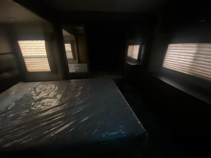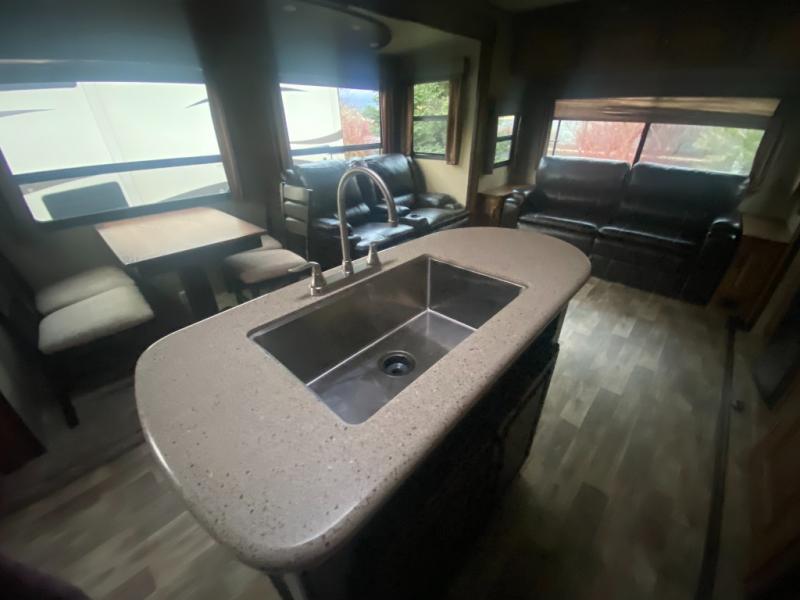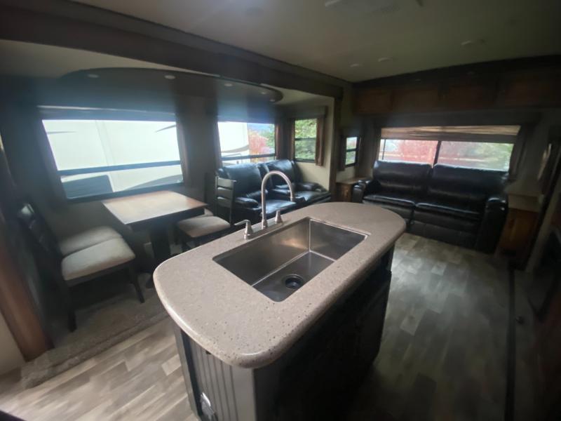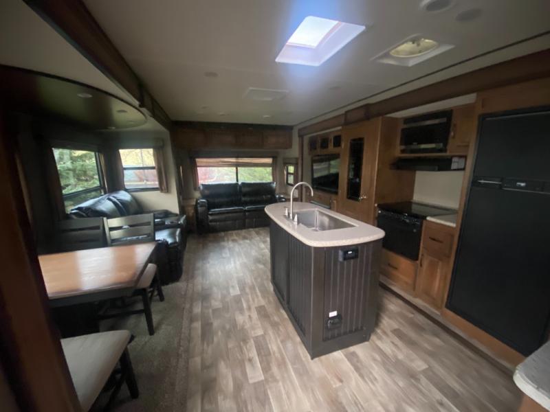 The slide opposite the door side features a 39" TV entertainment center with fireplace, a large pantry, three burner range, and refrigerator. An off center island is where you will find a double sink, more counter space, and a bit more storage. There is also a hutch with overhead cabinets along the interior wall, plus so much more!