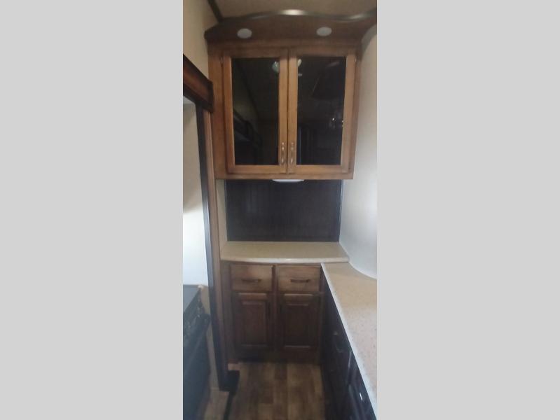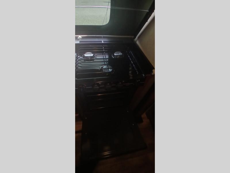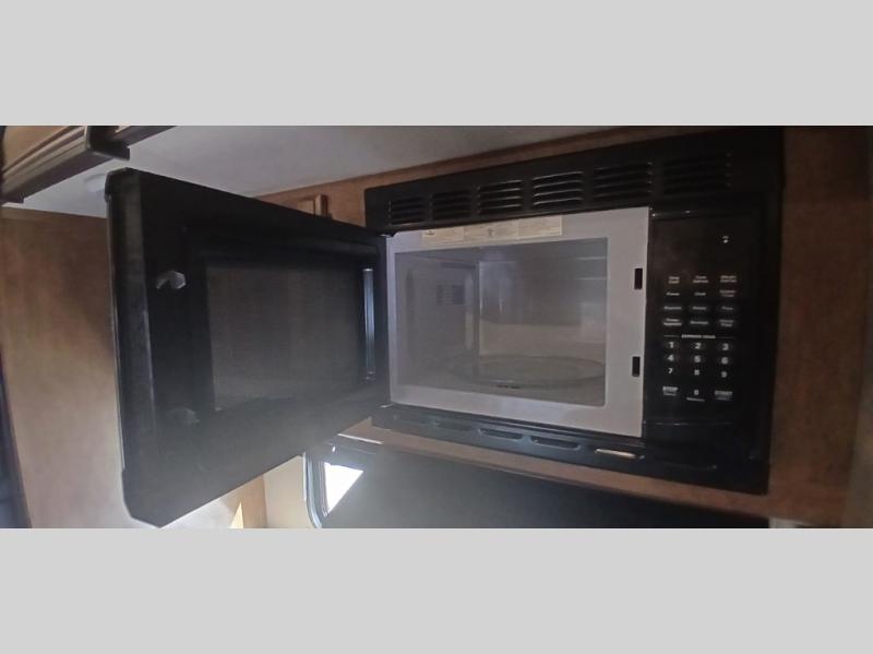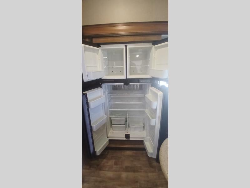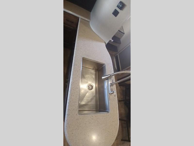 The kitchen features all the amenities you need to prepare and cook food while traveling with an 8 cu. ft, or 12 cu. ft. refrigerator, counter space, and three burner range with microwave oven slide. There is a counter peninsula with double sink, and plenty of storage both above and below the counter for dishes and things.
