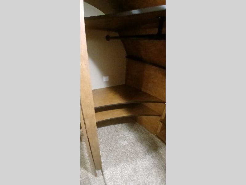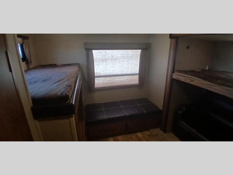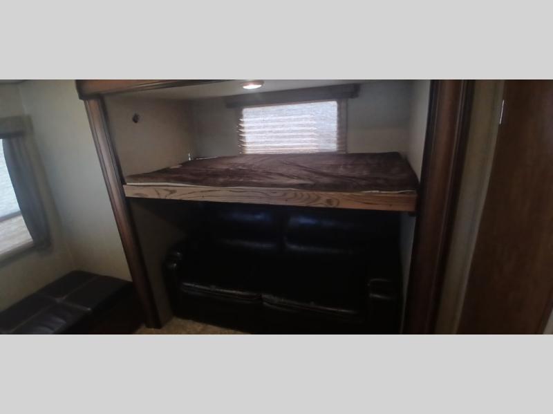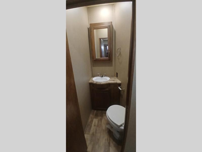 Back through to the rear find a bunkhouse and half bath that is the perfect hangout for the kids or extra guests. Once inside enjoy the wardrobe storage on the left. There is a TV entertainment center with 30" x 74" bunk above along the curb side wall. A 28" x 60" lounge with drawers beneath stretched across the rear of the unit. On the right side you will find a jackknife sofa beneath a 36" flip-up bed above. The half bath just off the slide provides a toilet, sink and medicine cabinet, plus so much more!