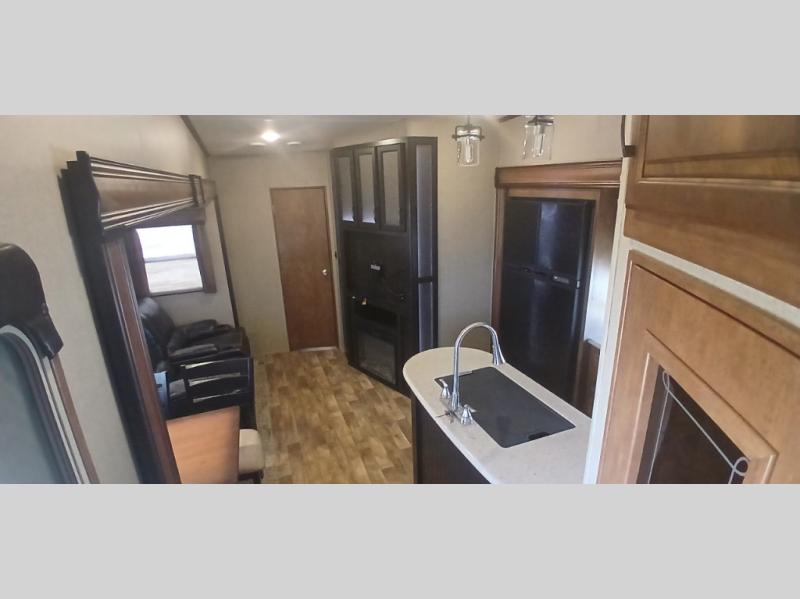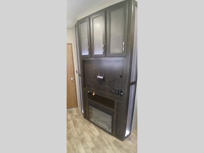 Now, step inside and find a spacious interior with dual opposing slides in the main living area. A nice size pantry for food storage is straight inside the door. To the left find a slide out booth dinette or optional dining table with chairs and theater seats or optional tri-fold sofa. There is also a nearby 39" TV with fireplace for enjoyment along the angled bathroom wall.