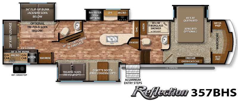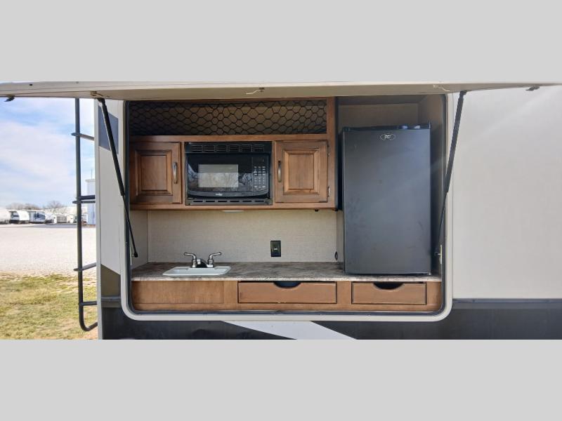 Model 357BHS has room for everyone plus a few extra! Notice the exterior kitchen along the rear curbside featuring a refrigerator, two burner stove top, single sink, microwave, and storage. The perfect feature for those who enjoy cooking and dining outside!