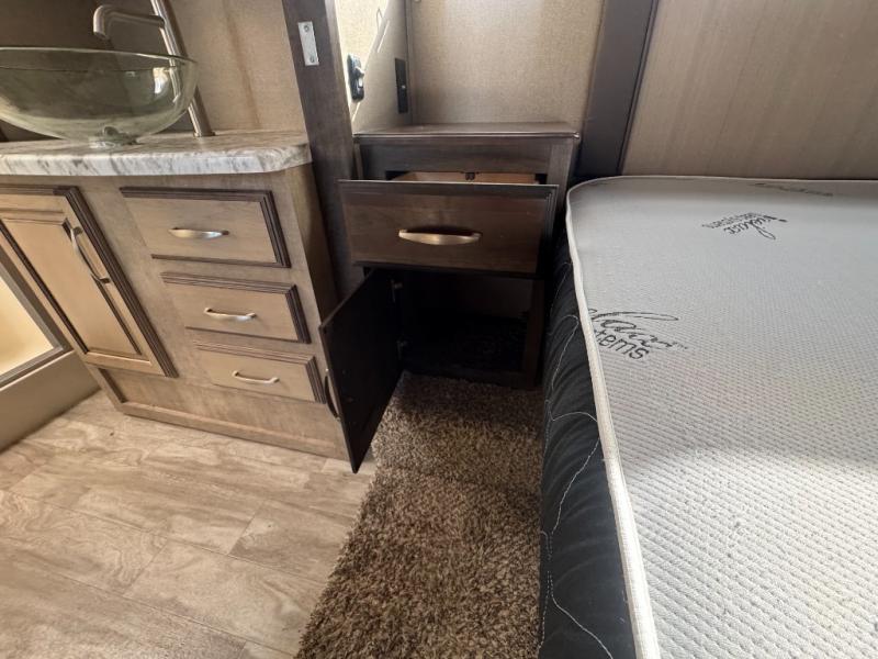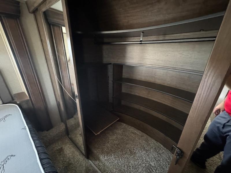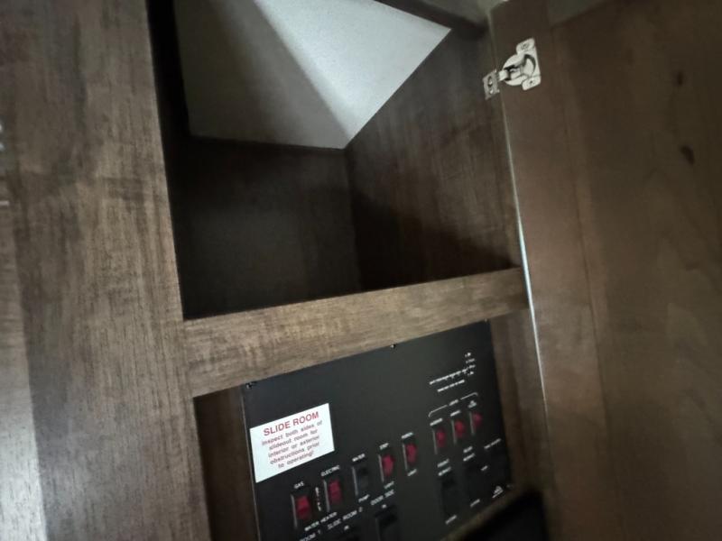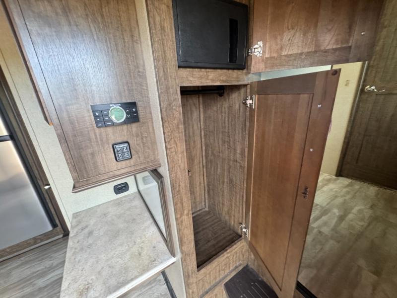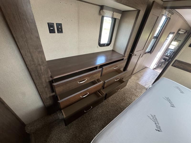 You can also enter the front bedroom from the hallway door. Here you will find a slide out bank of drawers on your right. Opposite enjoy sleeping on a slide out king size bed with pull out ottoman off the foot of it, and a full front closet with shirt storage. It is also prepped for a washer and dryer if you choose to add the units, plus so much more!