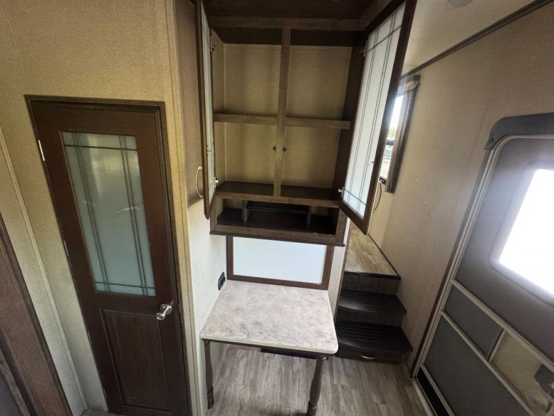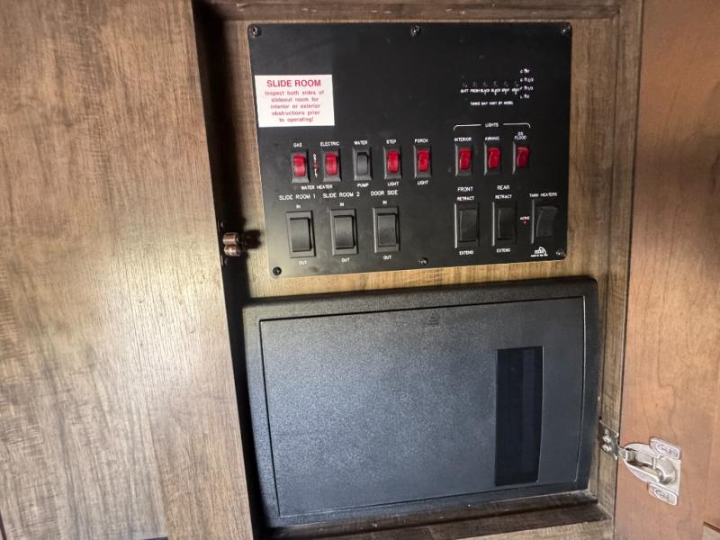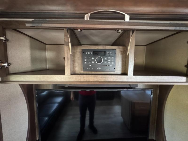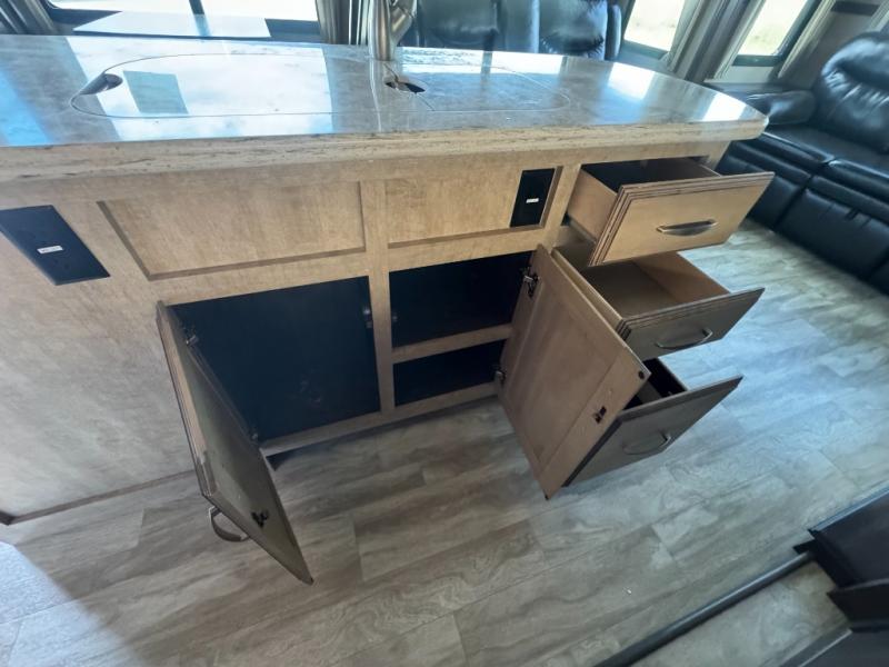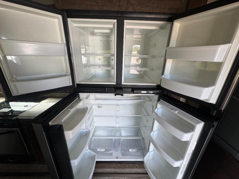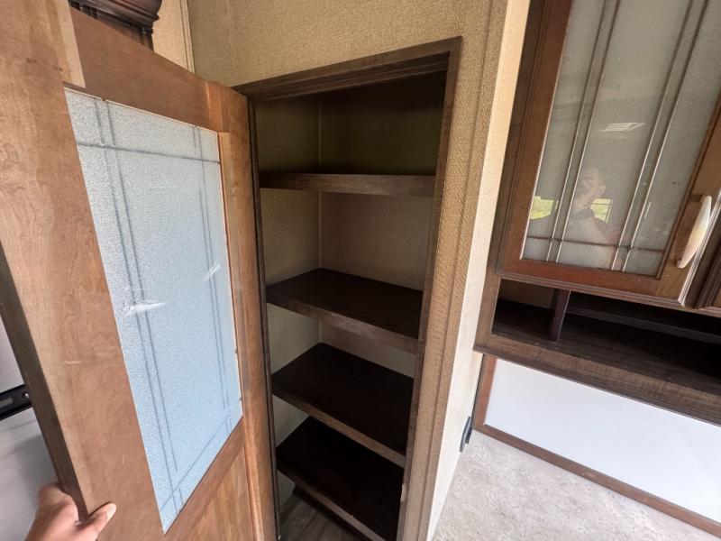 The slide opposite the door side features an entertainment center with LED TV and fireplace. There is also a three burner range for cooking with counter space on either side, plus an 18 cu. ft refrigerator for your perishables within the slide out. Along the interior wall find a pantry, and desk with overhead storage.