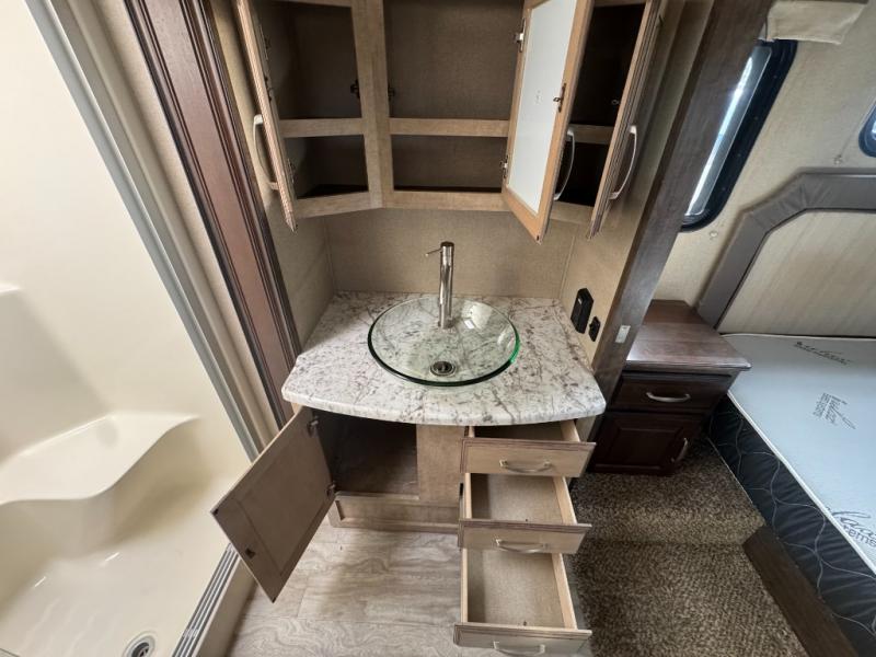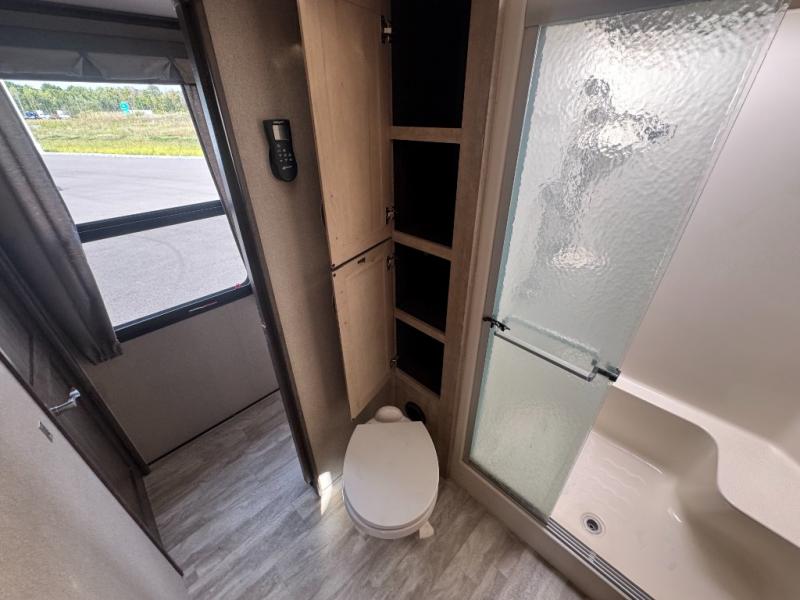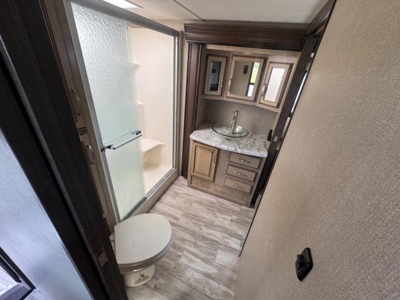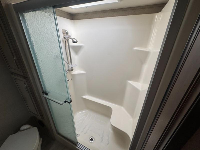 Head up the steps to a front bedroom and bath. The bath offers a large shower with seat and skylight, plus a toilet and linen cabinet. There is also a slide out vanity with sink and medicine cabinet which is attached to the bedroom slide out giving you much added space. A second bath entry door slides to provide easy access to the bedroom.