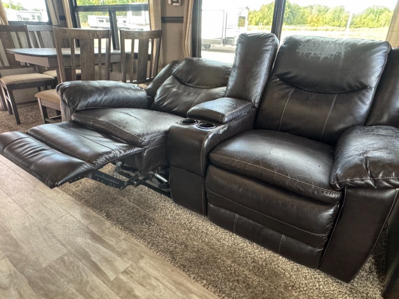 Enter and find a spacious combined kitchen and living area with dual opposing slides. There is seating to your immediate left as you enter, and along the rear wall. In the slide to your left you will enjoy a free standing dinette with four chairs, plus theater seating further down, or choose optional lounge chairs to replace the theater seating instead. Along the rear wall there is a hide-a-bed sofa with storage above. You can easily entertain guest here, and it also provide sleeping space to overnight guests.
