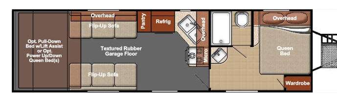 Haul Your Toys!For maximum cargo space you will love this Track n Trail toy hauler by Gulf Stream Coach. Model 26RTH features a rear ramp door to make loading and unloading a cinch. There are double flip-up sofas with overhead storage, and an optional power up/down set of queen beds for added sleeping space.