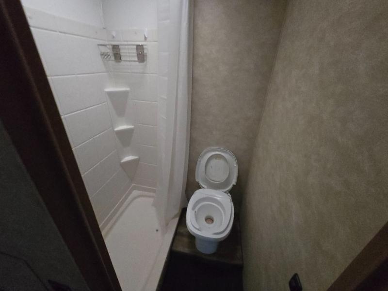 The front features a queen size bed with storage wardrobe, overhead cabinets, and a private toilet and tub/shower, plus separate sink.