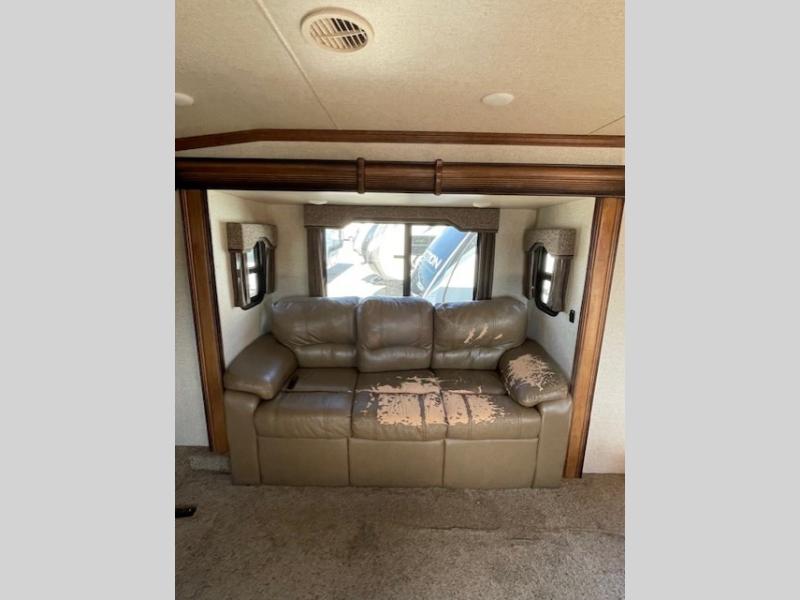 Step inside and head up to the raised living room which features dual opposing slides both with a sofa to enjoy. These can easily become additional sleeping space if needed at night. There is also theater seating for two at the top of the steps to your left. A great space to entertain or enjoy conversations with family and friends. The entire front wall shows off a large flat screen TV and entertainment center with storage both above and below.