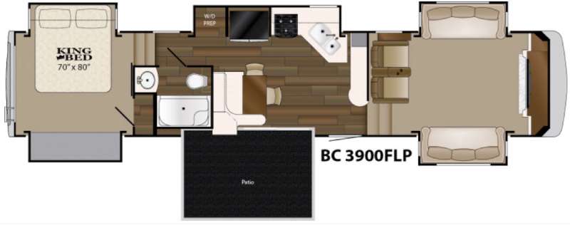 The outdoor patio that extends off the curb side wall is the popular feature of this Big Country fifth wheel unit. Open up the sliding doors to extend your living space right outdoors. The patio provides a safe space to hang out off of the ground while keeping you nice and dry too.
