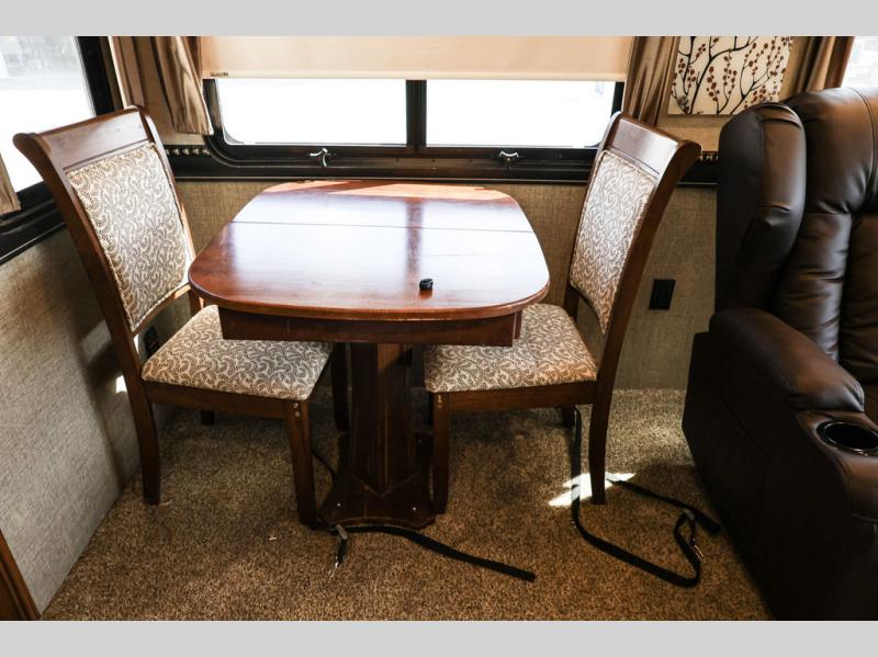 As you enter notice how spacious it feels with dual opposing slides fully extended. There is a slide out dining table with two chairs, and two swivel recliners gliders to the left as you enter.