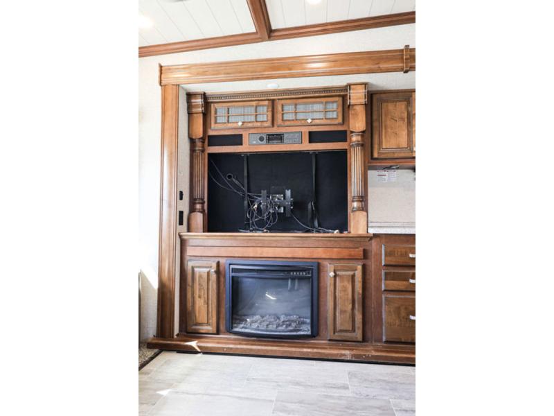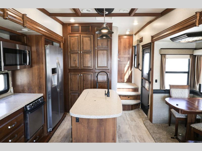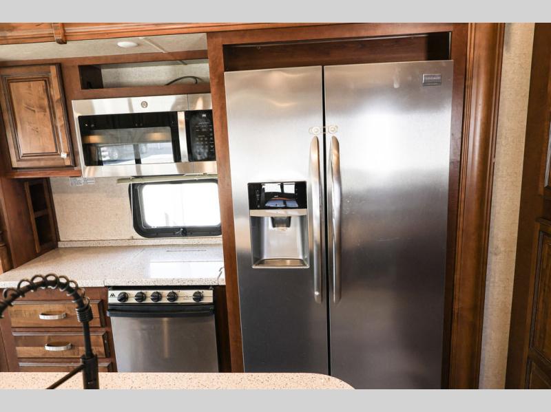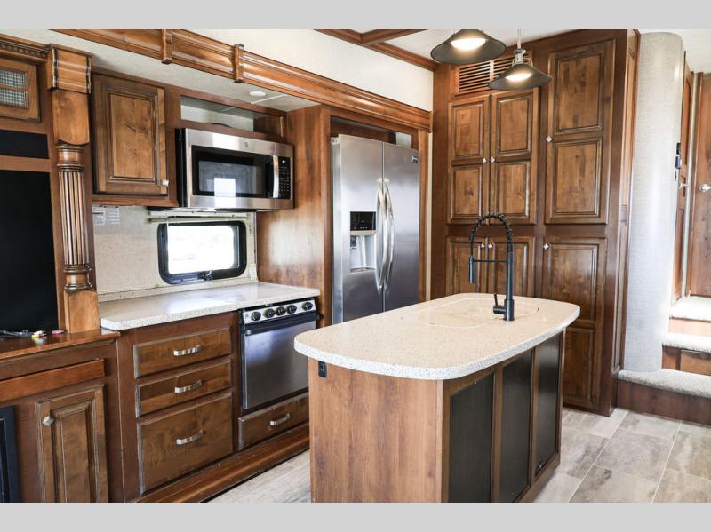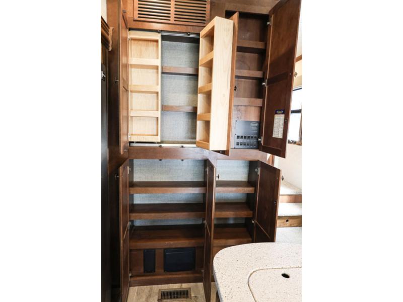 The slide opposite the door side provides an entertainment center with pull-out desk, some counter space, and a three burner range next to a double door refrigerator. The double sink can be found in the nearby kitchen island which also provides added storage and more counter-top prep space. There is a floor to ceiling storage pantry along the interior wall straight in from the door.