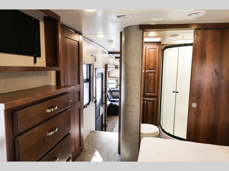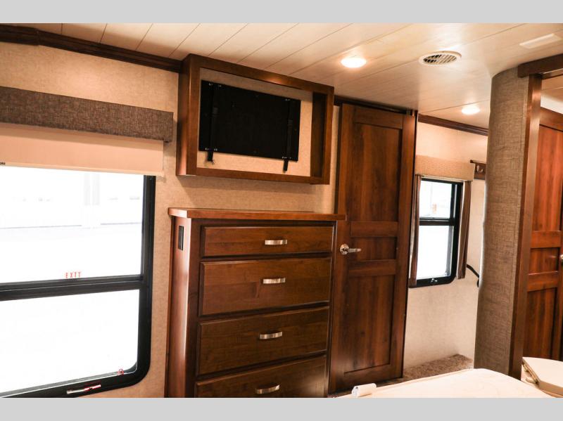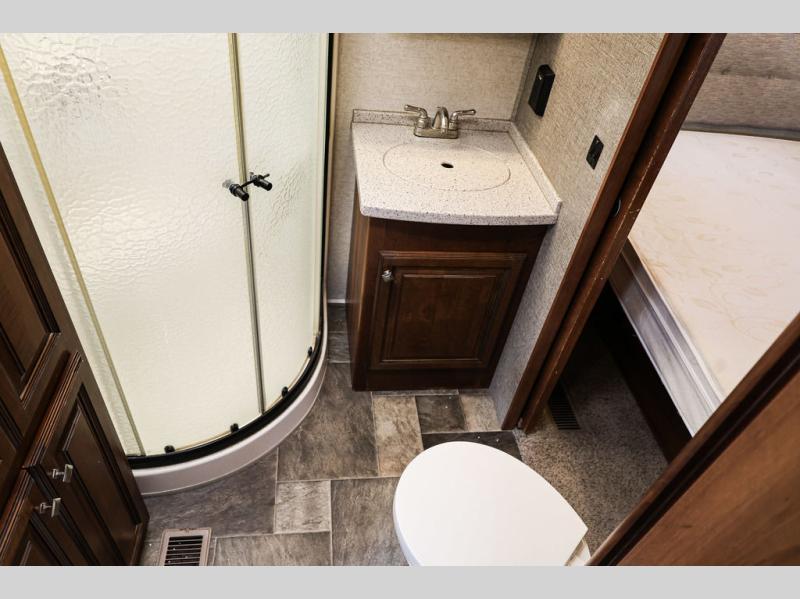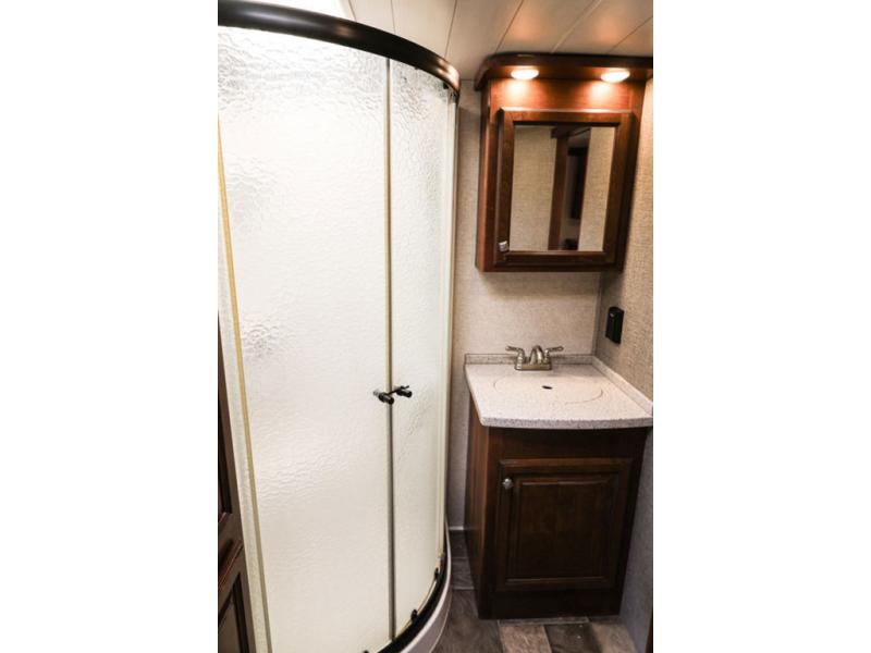 The front of this Bighorn model is where you can relax and unwind on a king bed slide out. Here you can enjoy a great night's sleep. There is a dresser opposite the bed, along with a front closet for hanging clothes which also features drawer space inside along the road side wall. There is also a corner closet that has been prepped for a washer and dryer if you choose to add for more convenience, plus so much more!