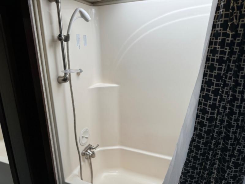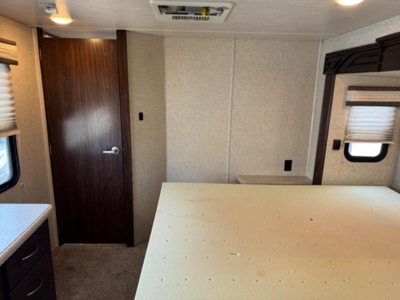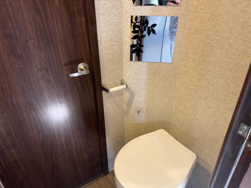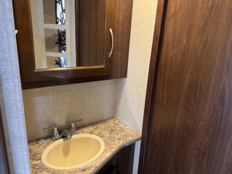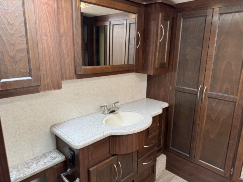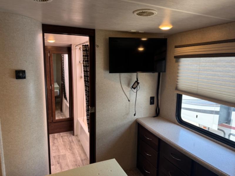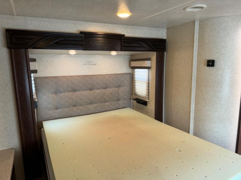 Head up the steps to find a spacious master suite with a slide out queen bed, a nightstand, and a dresser opposite the bed. A sliding door leads into the front bathroom which includes a tub/shower, toilet, vanity with sink, and large closet with one section prepped for a washer and dryer if you choose to add.