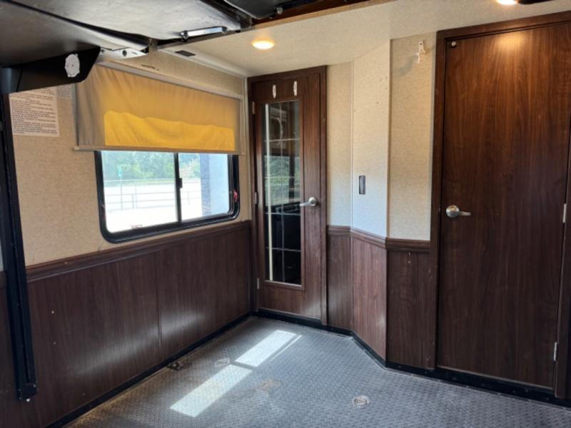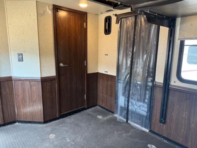 In the main living space you will find very comfortable accommodations for your off road crew! There is a sofa and refrigerator slide out to the left of the main entry door. Straight across from the door find a second slide which includes a large L-shaped sofa with table, and counter peninsula including a double sink, and three burner range, plus overhead storage for dishes and things. There is also a nice entertainment center along the interior wall for viewing easily from anywhere in the room.