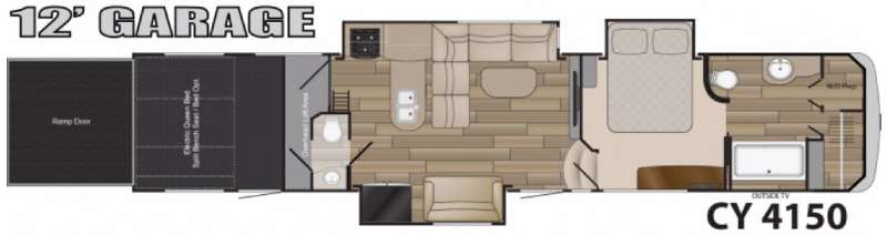 Load up your toys easily into the 12' garage space using the rear ramp door, and side man door too. On the inside you will find plenty space to add an overhead electric queen lift bed with lower split bench seat/bed option if you like, and there is also a twin loft in the front area with a ladder just outside the half bath looking over the living area. The half bath includes an entrance from the cargo area and the living room.