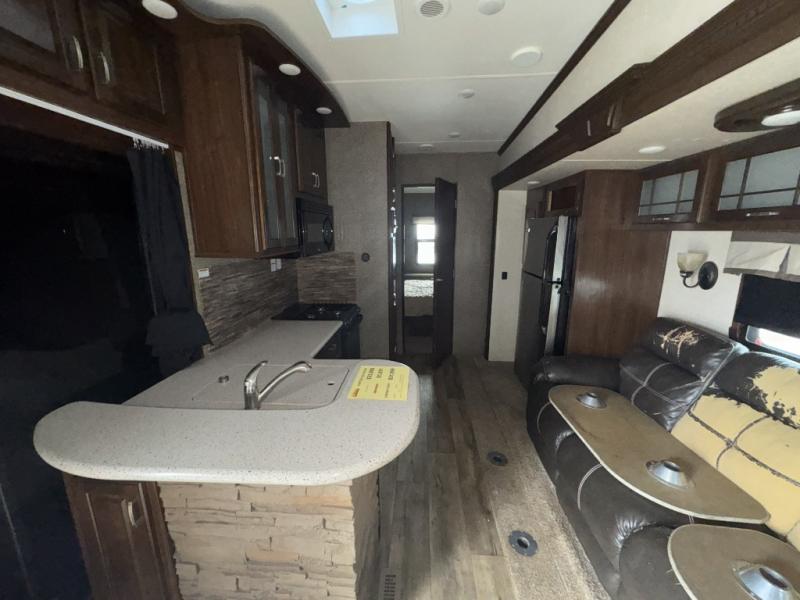 Enter the side door furthest to the front and enjoy the wide open interior with large slide out opposite the door. There is a sofa straight ahead along the interior living room wall with overhead storage above. The slide out sofa opposite the door provides plenty of seating along with a refrigerator and pantry for dry good storage.