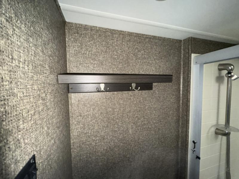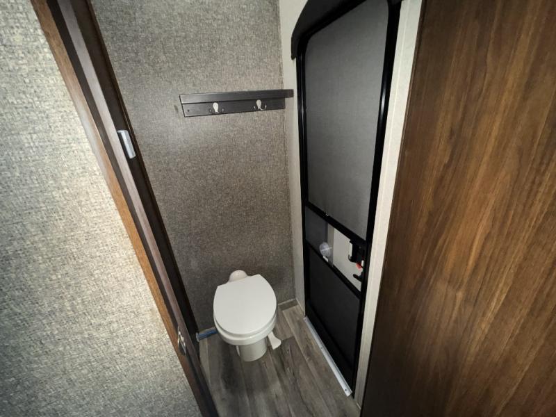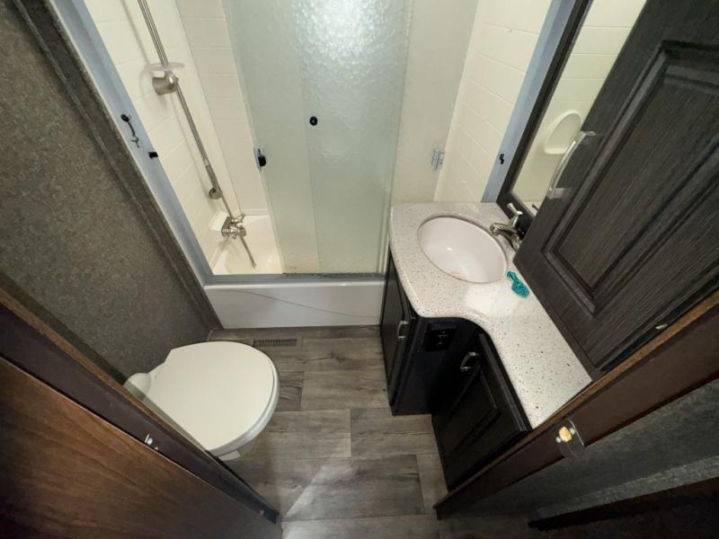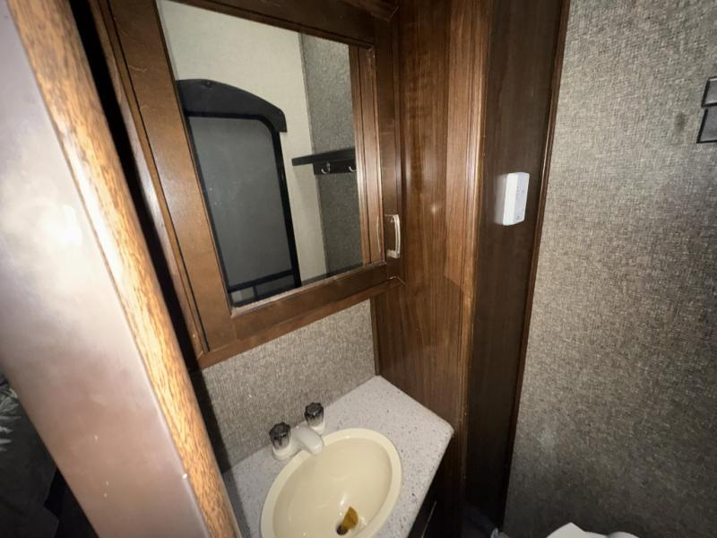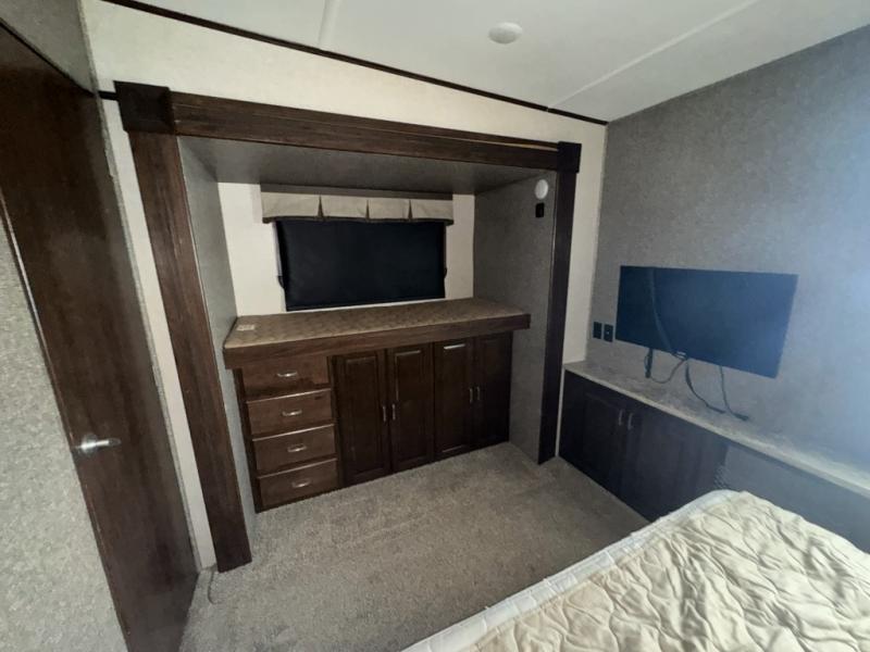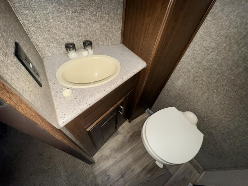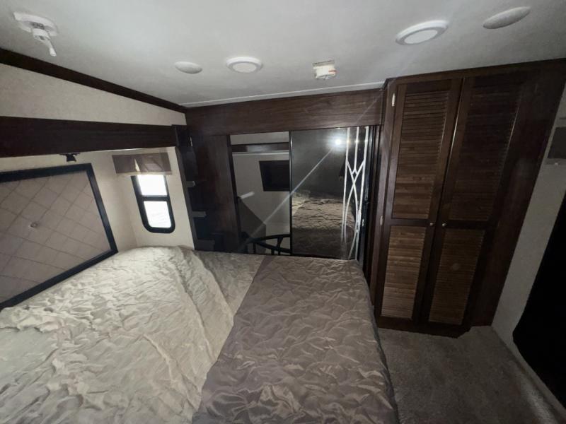 Back through to the rear of this Gateway fifth wheel you will find a second bedroom. Here your family or guests will enjoy a slide out queen tilt bed with nightstands, and a slide out bunk above a wardrobe opposite. There is also a private half bath with toilet, sink, and linen cabinet, with its own exterior entry door, and so much more!
