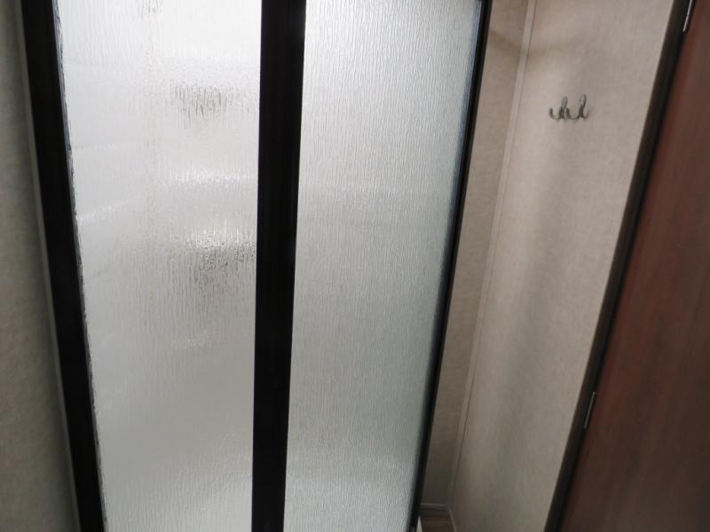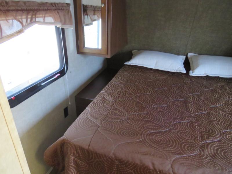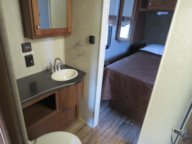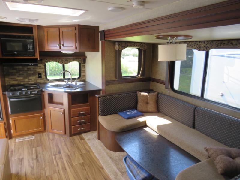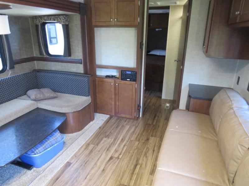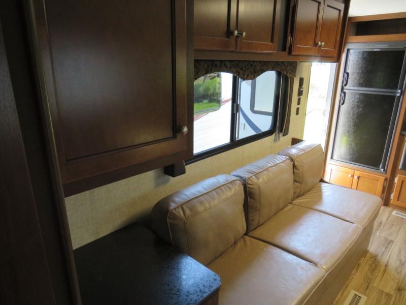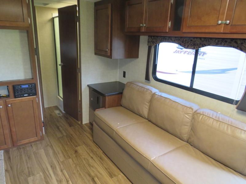 A slide out u-shaped dinette is opposite the entry door and features plenty of space to enjoy dining at, plus it can easily be transformed into additional sleeping space when needed at night. A nearby entertainment center features an optional flat screen TV on the interior wall which can be easily viewed from the dinette or the sofa which is to the right of the rear side entry door. The sofa features overhead storage, plus there is additional storage between the sofa and the walk-through bath.