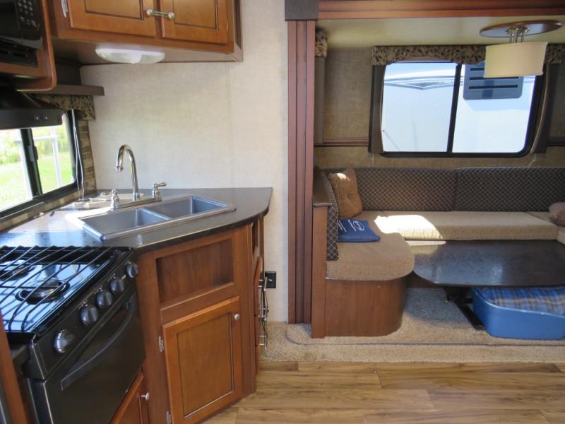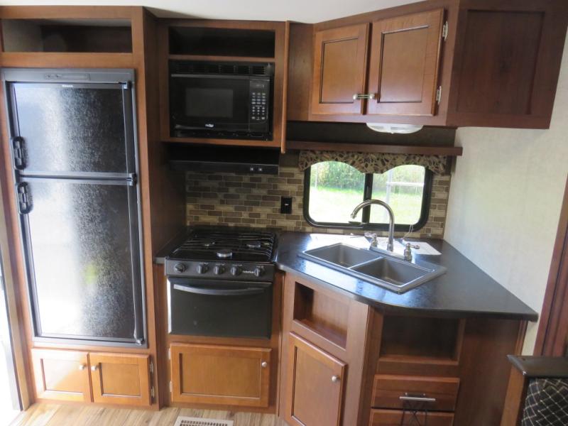 Step inside the rear most side entry and find a refrigerator, three burner range and double kitchen sink along the rear travel trailer wall. There are also overhead cabinets for storage above the sink.