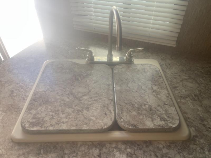 From the entry door, to the left there is a double kitchen sink, there burner range, overhead cabinet for dishes or other things, and a refrigerator. On the opposite side find a slide with a sofa and a dinette. Both convert into extra sleeping space at night. Adjacent to the dinette find a storage cabinet. Along the foot of the bed, facing the main living area there is an entertainment center.