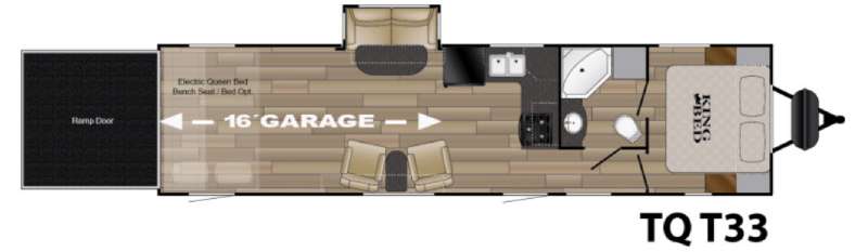 In the garage area you will find 16' of garage space for all of your gear and toys. After everything is unloaded, you can set up the bench seat for more seating in the trailer. At night the bench seat converts into a bed and there is an electric queen bed for more sleeping space. The side door allows easy access inside the garage without having to go through the rear ramp door, and more!