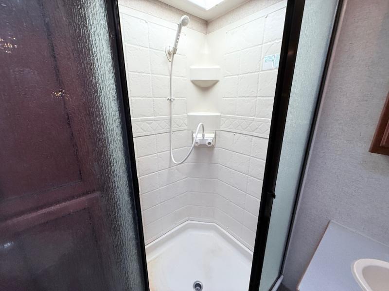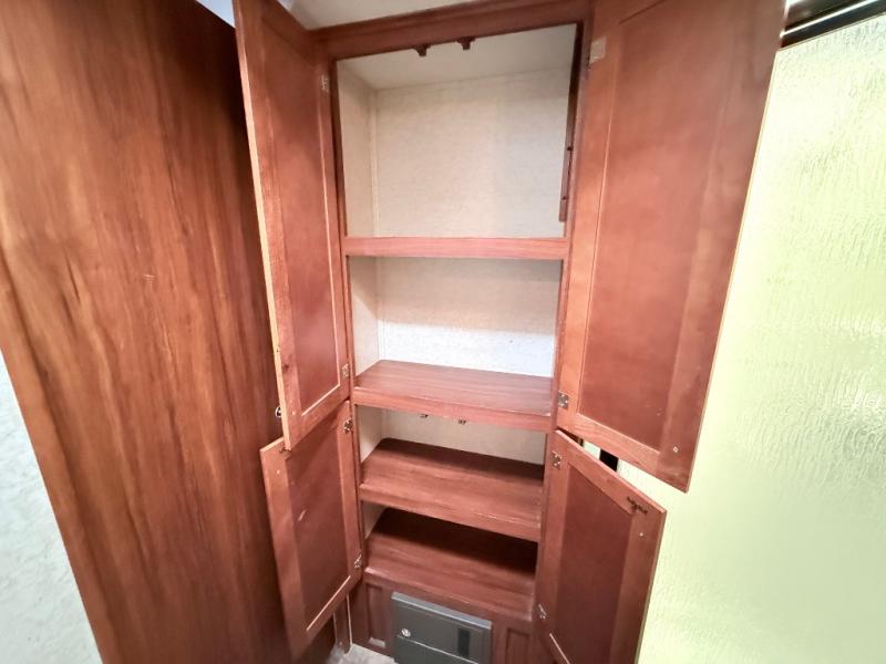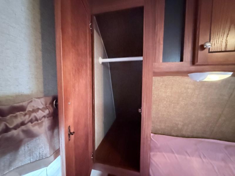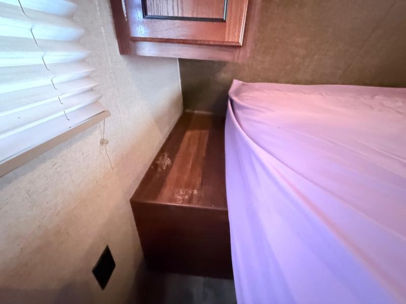 Enter and head right to the front bathroom and master bedroom suite. The side aisle bath features a large linen cabinet, angled shower, toilet and sink. A sliding door leads directly into the front master bedroom which features a queen size bed with storage above, and dual nightstands and shirt closets.