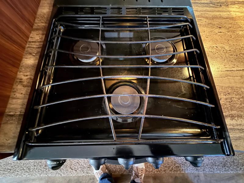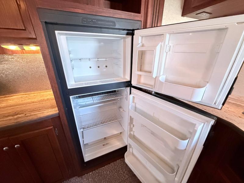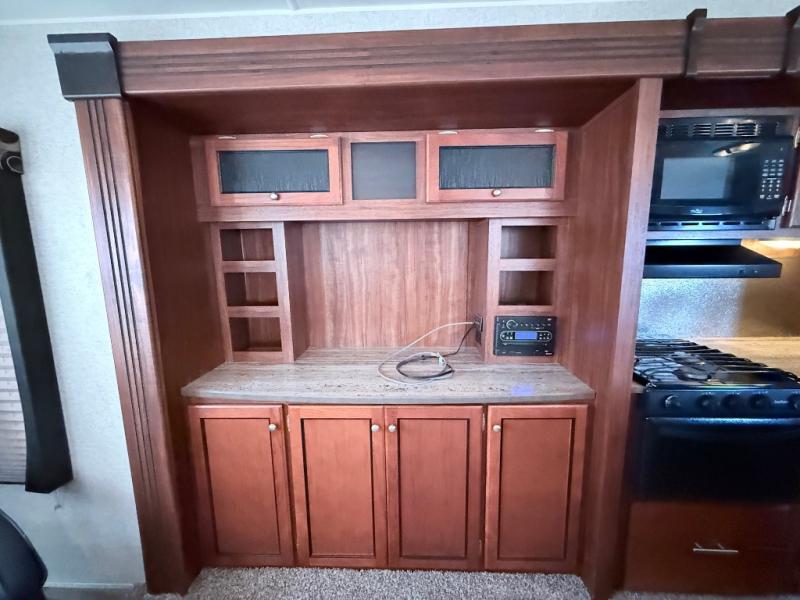 Along the rear wall find two swivel rockers with overhead storage the entire width of the unit. The slide opposite the door features a entertainment center with storage both above and below, plus a space for a flat panel TV. This slide also features the kitchen appliances. There is a three burner range with microwave oven, counter area and refrigerator. Find additional counter space with the center island, and the counter found along the interior wall that features a double kitchen sink, and plenty of storage space both above and below.