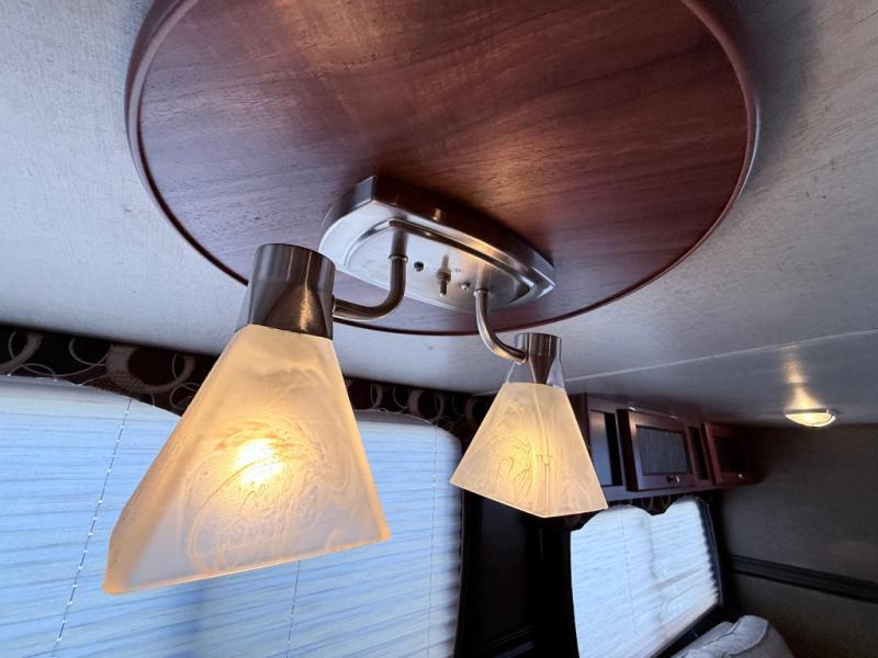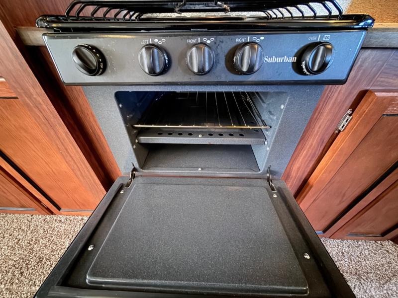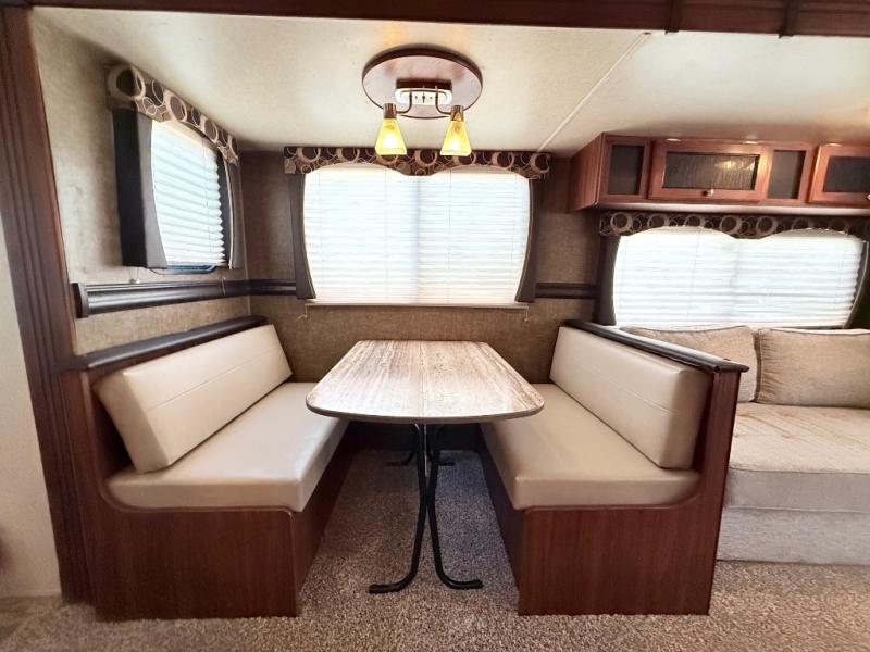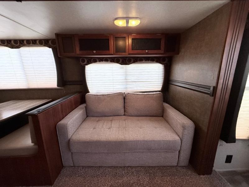 The main living area to the left of the main entrance features a slide out booth dinette and sofa with overhead storage. Both provide ample seating during mealtime and more, plus they can also be made into additional sleeping when needed too.