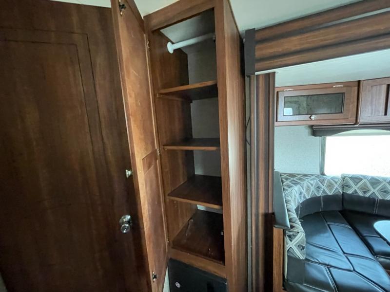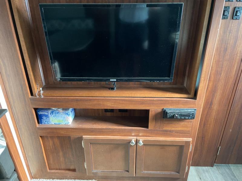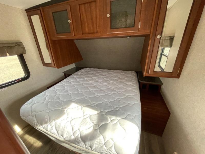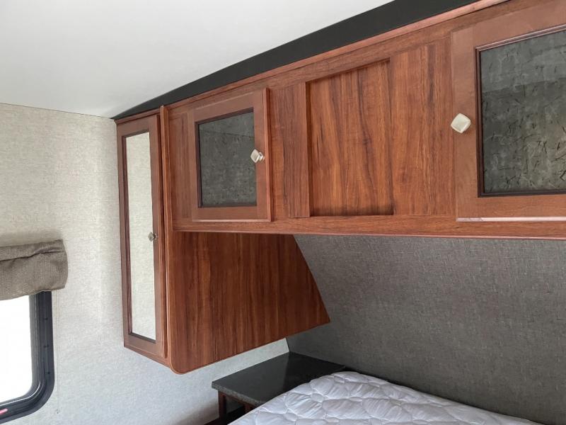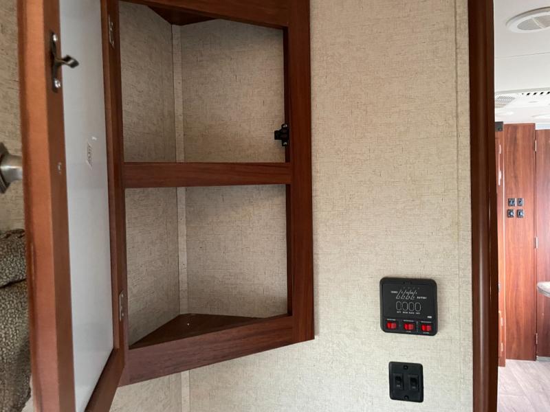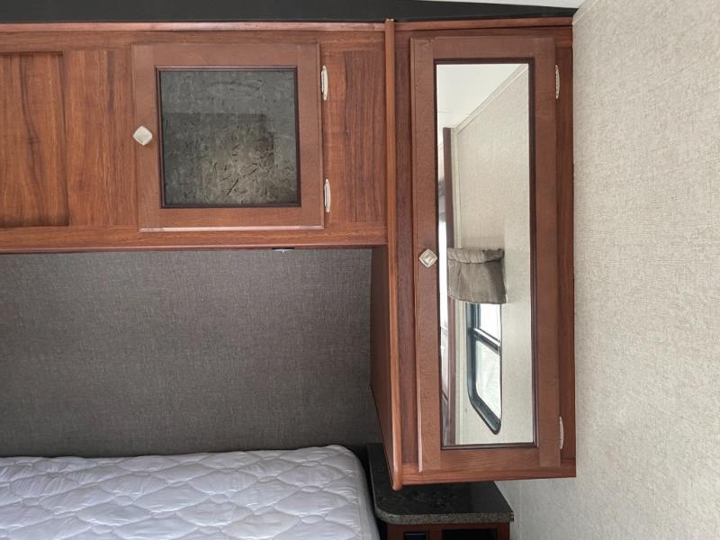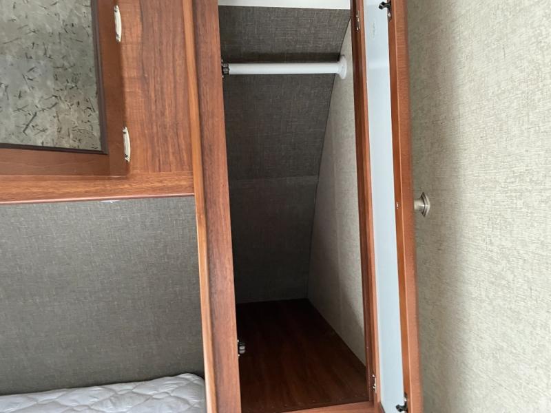 As you enter the trailer, to the right is a front bedroom with a queen bed, two wardrobes, and an overhead cabinet. There is also a swivel TV for your enjoyment.