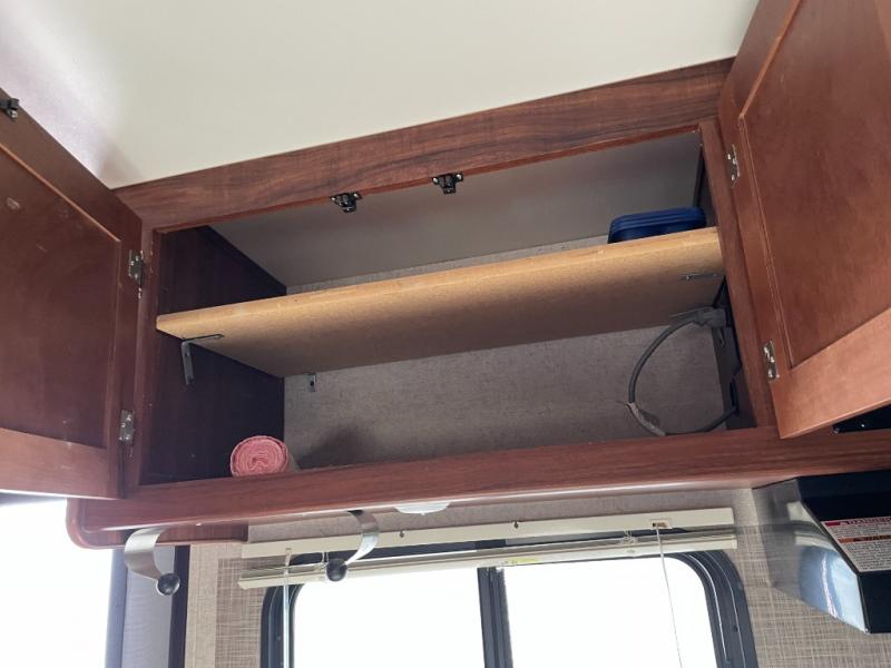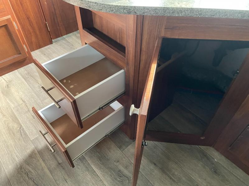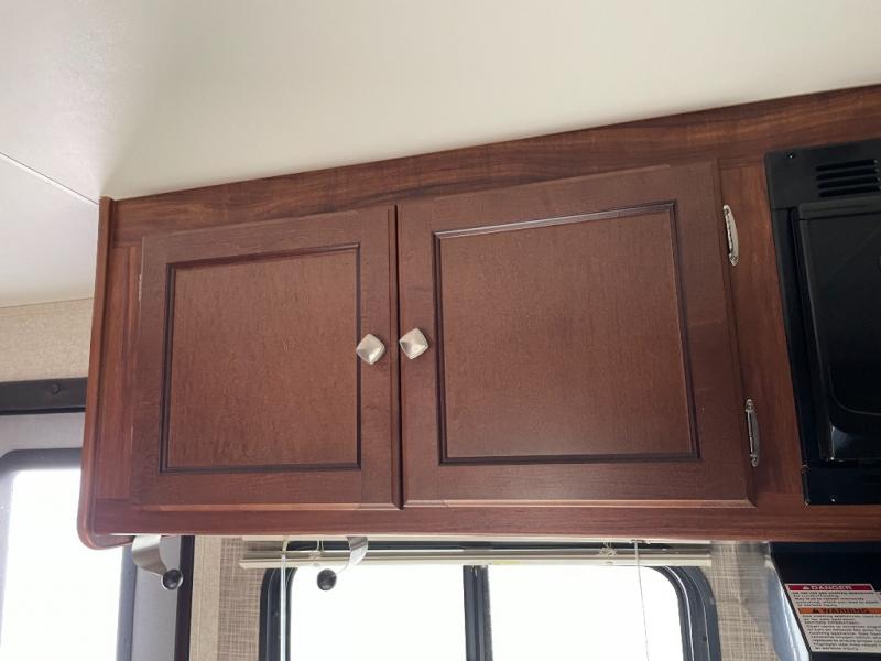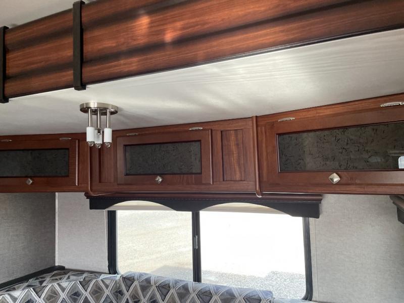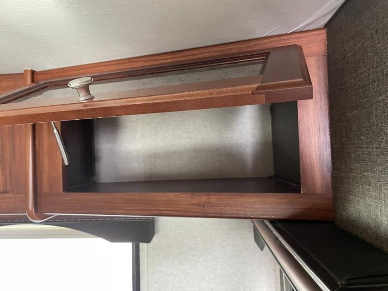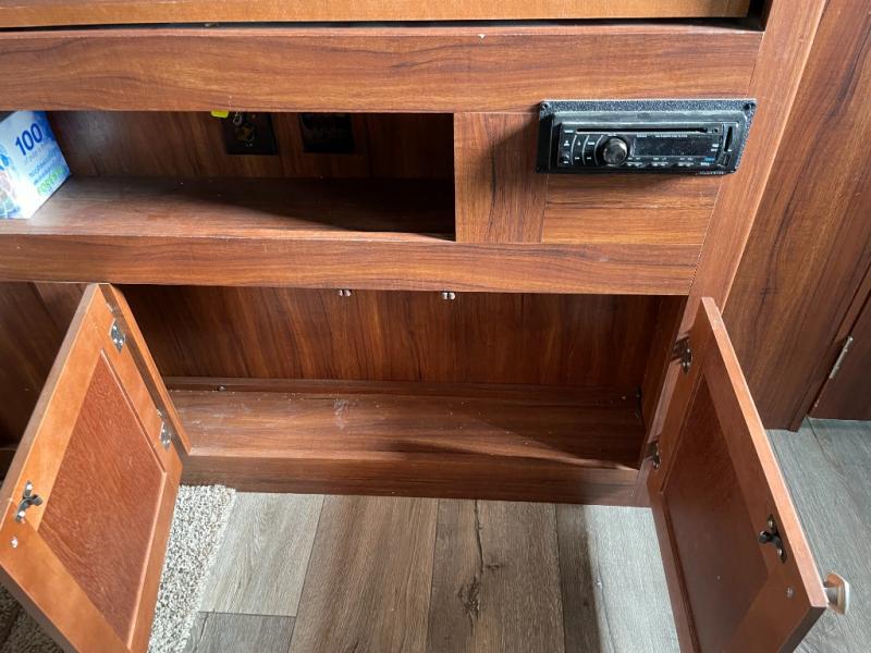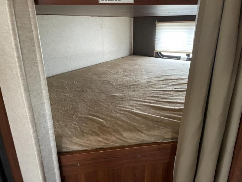 As you enter the trailer, to the right is a front bedroom with a queen bed, two wardrobes, and an overhead cabinet. There is also a swivel TV for your enjoyment.