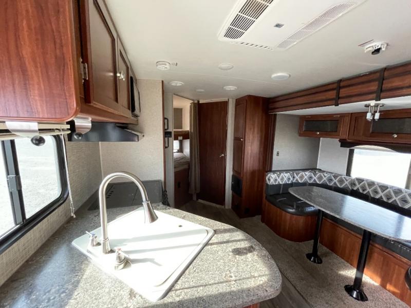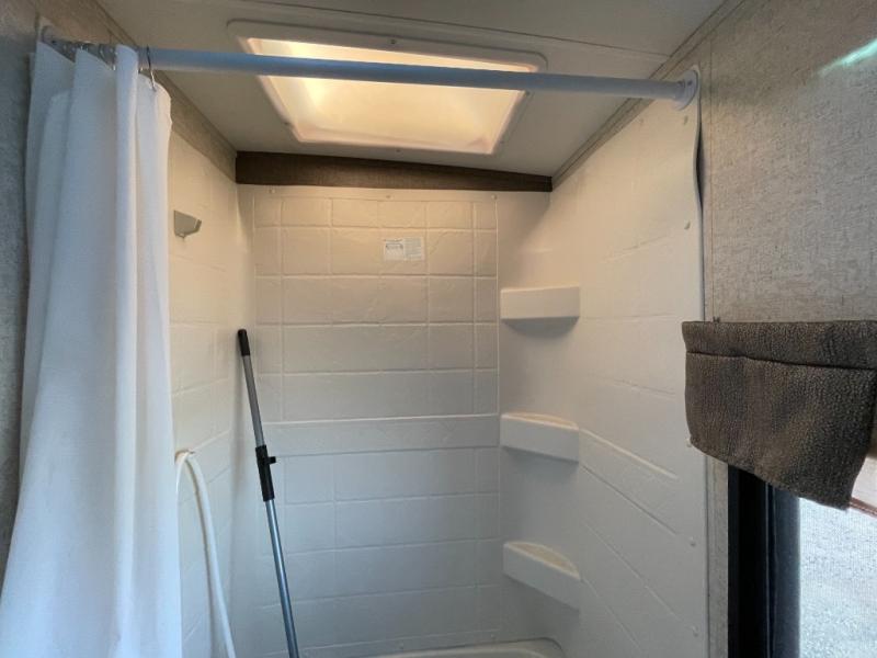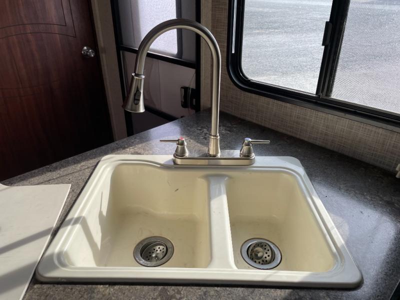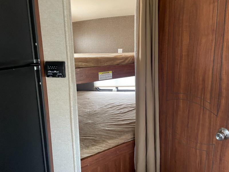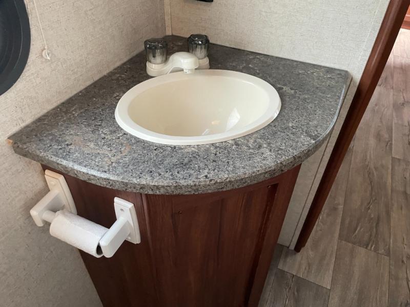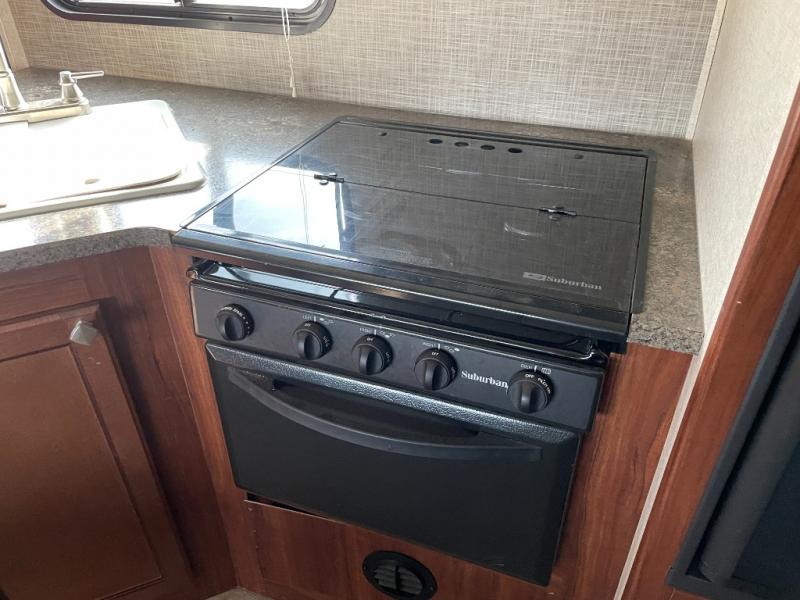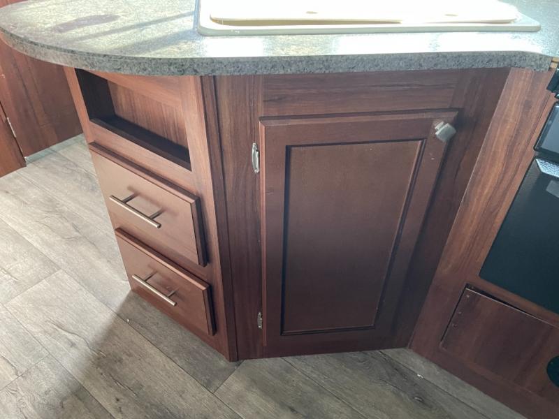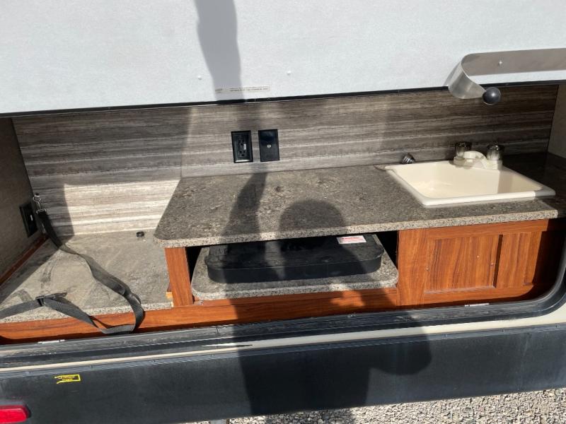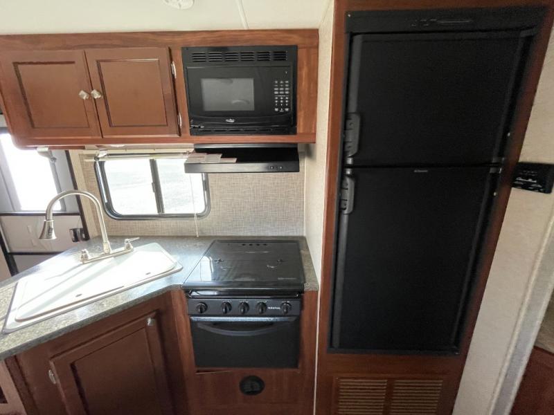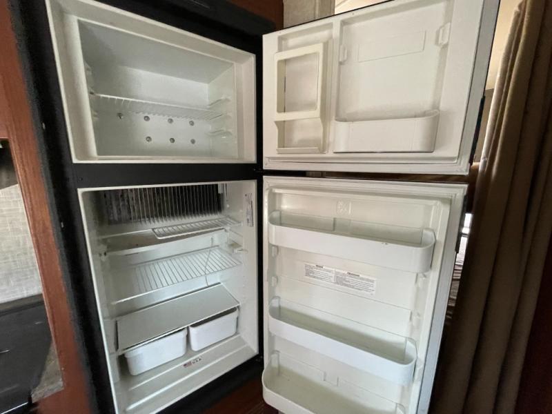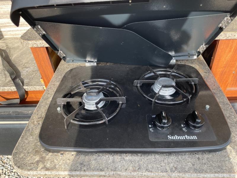 The main living area has a u-dinette slide where you can enjoy your meals. At night the dinette converts into additional sleeping space. Adjacent to the slide you will find the swivel TV. To the left of the entry door there is a double kitchen sink, three burner range, overhead cabinet for dishes, and a refrigerator.